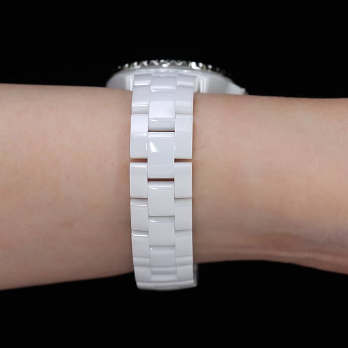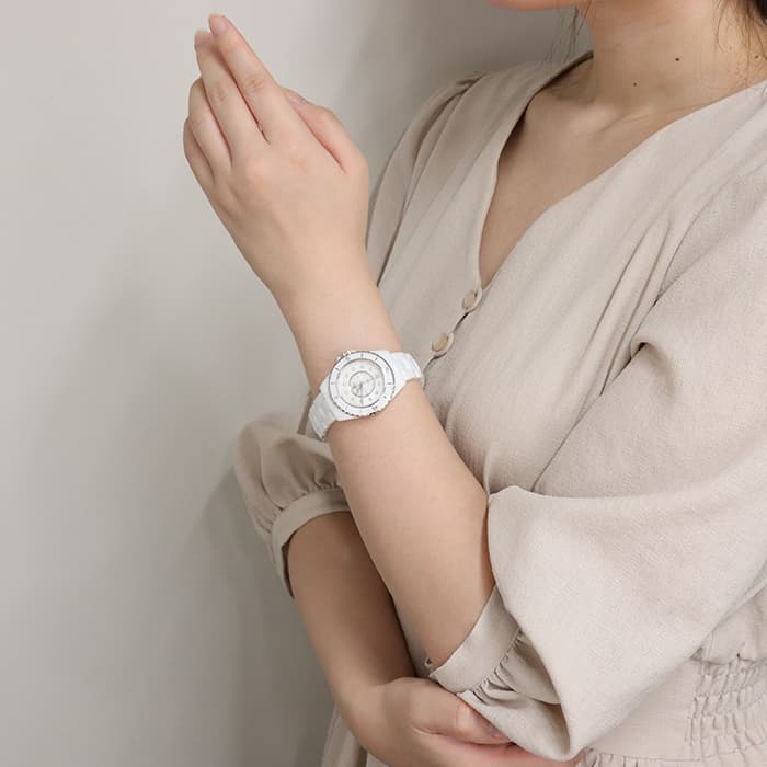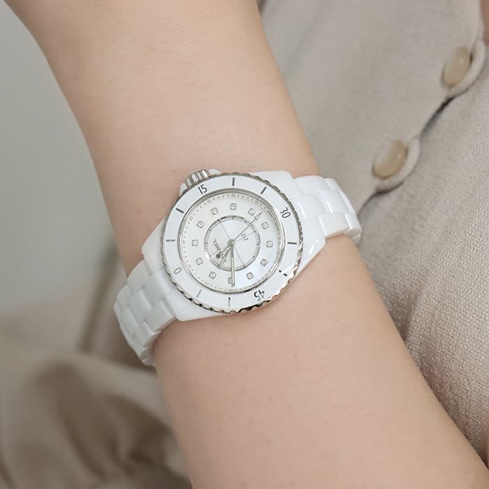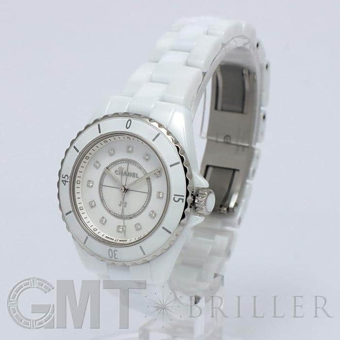 シャネルのアイコンウォッチ「J12」は、艶やかなセラミック素材を使用したスポーティなデザインが特徴です。セラミック素材はキズが付きにくいため、長い間同じ輝きを楽しむことができます。こちらのモデルは文字盤に光を反射して輝くホワイトシェル、10ポイントのダイヤモンドを使用しているので、動くたびにきらきらと手元を彩ります。33mmのケースサイズは女性用スポーツウォッチとしてちょうどいいサイズ感で、手元のお洒落に程よいインパクトを与え、また時刻の視認性にも優れています。アフターメンテナンスが簡単なクォーツ式で、時針・分針・秒針の機能が付いたシンプルなモデルです。バンド調整には特殊な工具を使用しますので、ご注文時に手首回りのサイズを入力いただけましたら、当店で無料で調整いたします。初めてのブランド腕時計にもおすすめの腕時計となっています。