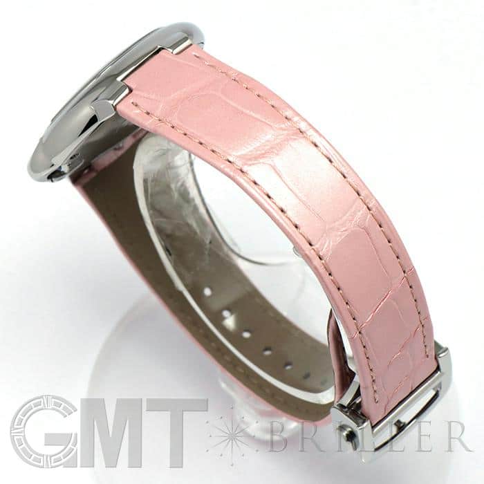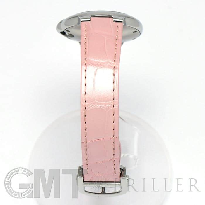 風船(バロン)のように丸いケースに、リューズのブルーのカボションを閉じ込めたバロンブルー ドゥ カルティエ。凸レンズのようにふくらみを帯びた33mmのケースに、ギヨシェ彫りの文字盤、剣型の針が優雅でエレガントな印象を漂わせています。やわらかなピンクの文字盤に映える青い針とリューズのカボション、統一感のあるレザーベルトがフェミニンなコントラストをつけていて、オンオフ問わずコーディネートしやすい自動巻きの腕時計です。