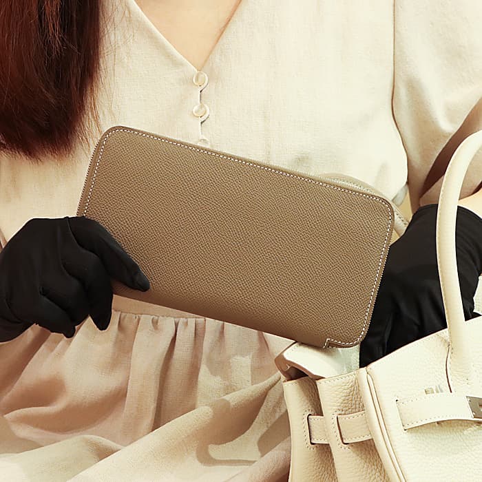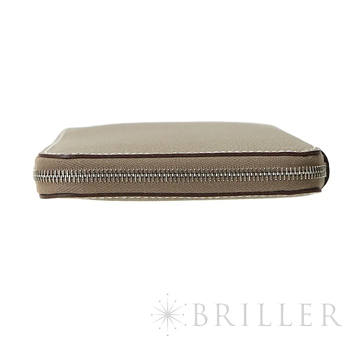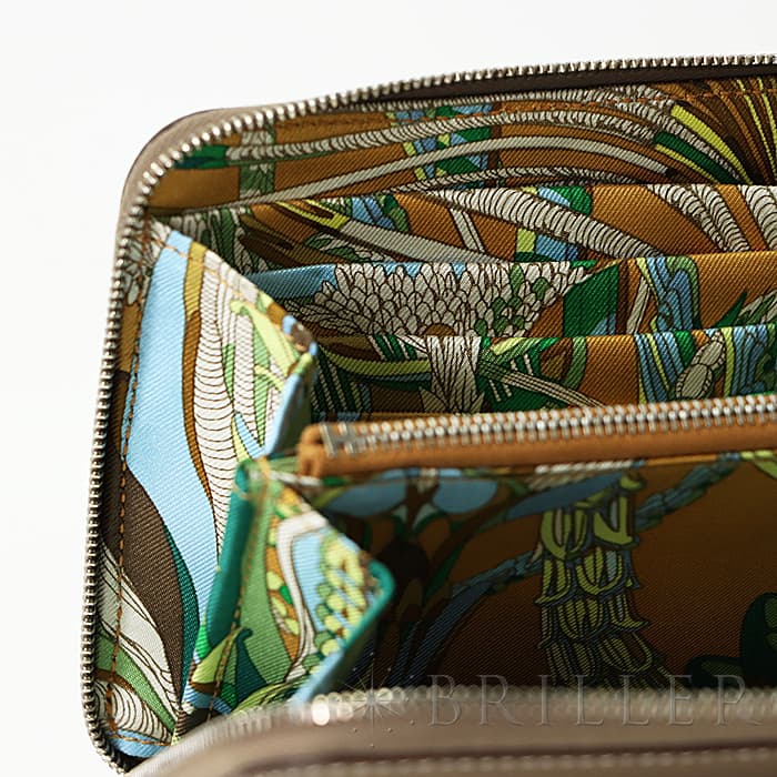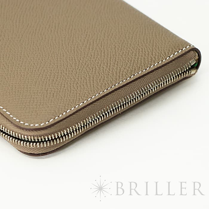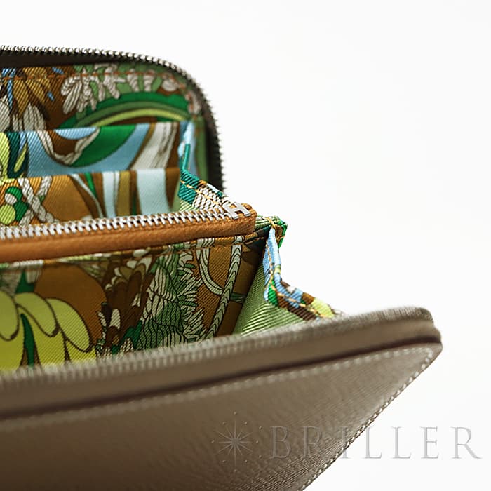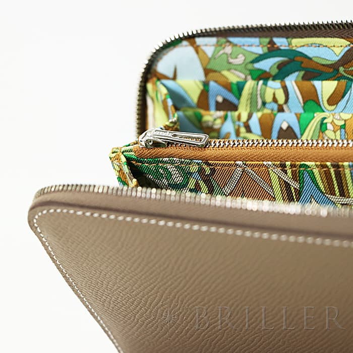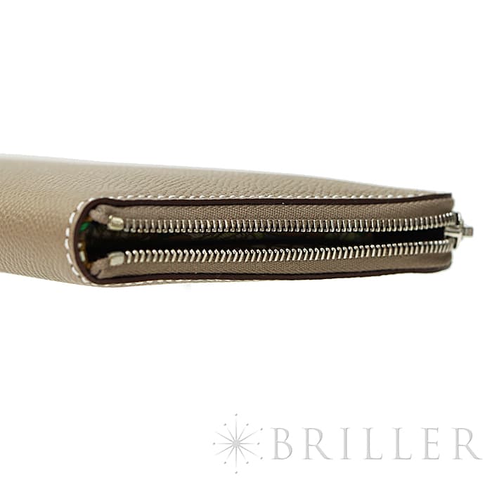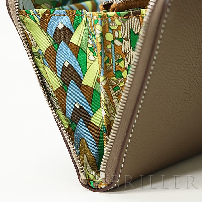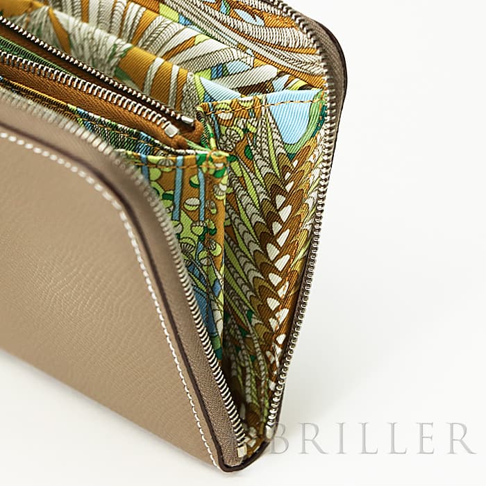 角が丸みを帯びたシンプルな長方形のデザインにラウンドジップが便利な「アザップ」。すっきりとして上品なフォルムで、内側にカレと同じシルク生地があしらわれた美しいロングウォレットです。内側にはカードポケットが合計12、中央に小銭入れが付いています。約1.5cmの厚さは女性の手でも持ちやすく、バッグの中でもかさばりにくいサイズ感です。エルメスの中でも定番人気の「エトゥープ」に、ホワイトのステッチが可愛らしく、ファスナーを開くと、グリーンとブラウンを基調とした美しい模様のシルクが現れる、デザイン性だけでなく、機能性もすぐれたおすすめの長財布です。Y刻印(2020年)のお品物です。