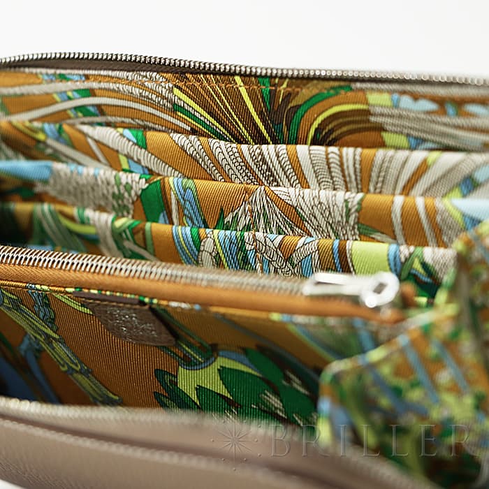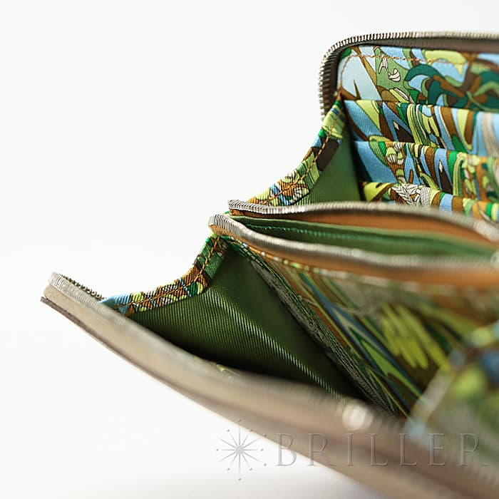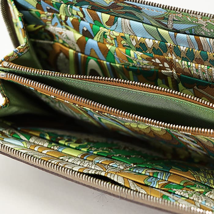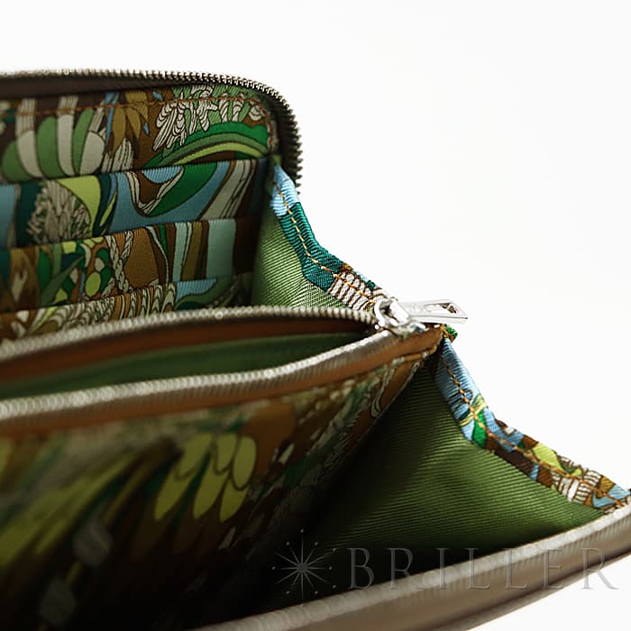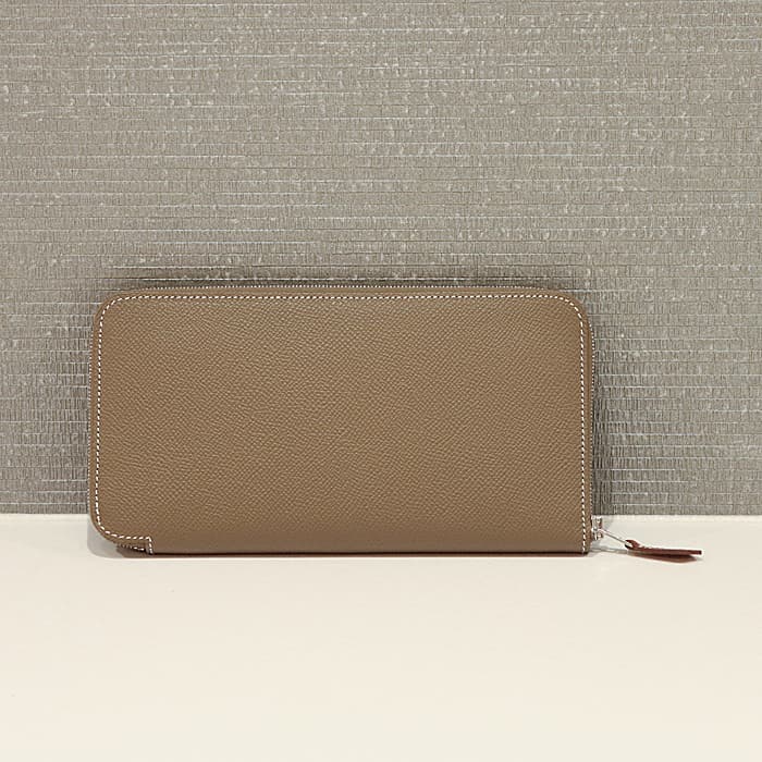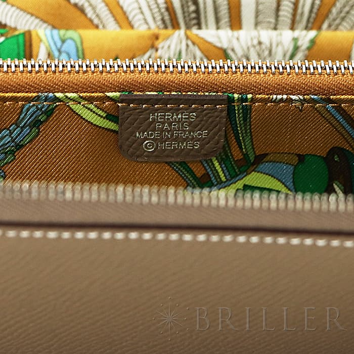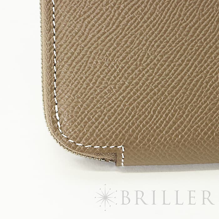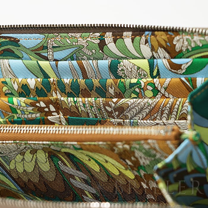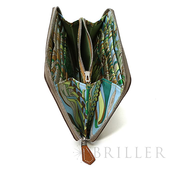角が丸みを帯びたシンプルな長方形のデザインにラウンドジップが便利な「アザップ」。すっきりとして上品なフォルムで、内側にカレと同じシルク生地があしらわれた美しいロングウォレットです。内側にはカードポケットが合計12、中央に小銭入れが付いています。約1.5cmの厚さは女性の手でも持ちやすく、バッグの中でもかさばりにくいサイズ感です。エルメスの中でも定番人気の「エトゥープ」に、ホワイトのステッチが可愛らしく、ファスナーを開くと、グリーンとブラウンを基調とした美しい模様のシルクが現れる、デザイン性だけでなく、機能性もすぐれたおすすめの長財布です。Y刻印(2020年)のお品物です。