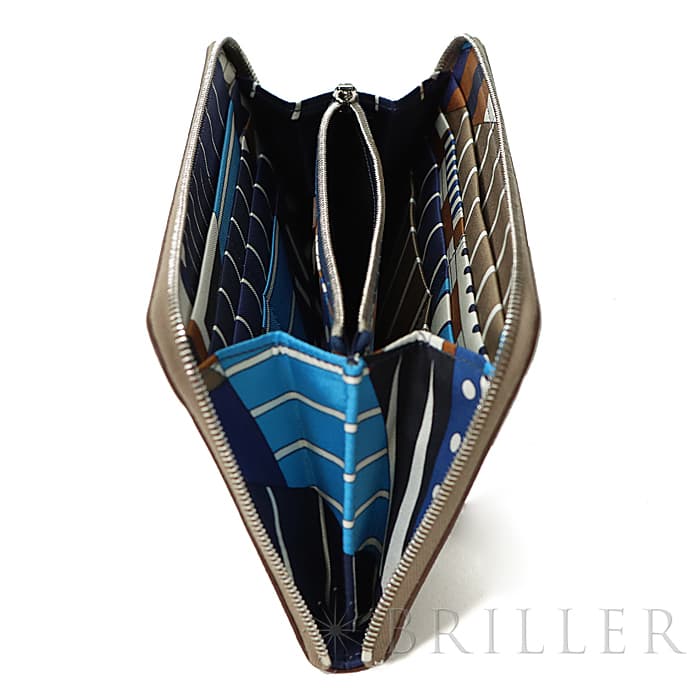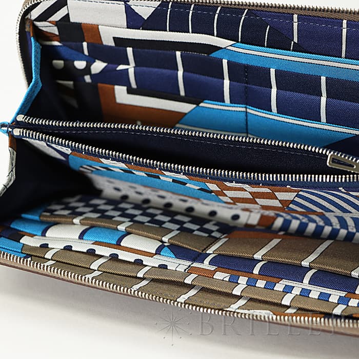 角が丸みを帯びたシンプルな長方形のデザインに、ラウンドファスナーが組み合わさった「アザップ」。すっきりとして上品なフォルムの「シルクイン」は、内側にカレと同じシルク生地があしらわれた美しいお財布です。内側にはカードポケットが合計12、中央に小銭入れが付いていて、約1.5cmの厚さは女性の手でも持ちやすく、バッグの中でもかさばりにくいサイズ感です。外側はホワイトのステッチが可愛らしい「エトゥープ」で、ファスナーを開くとネイビーを基調としたエレガントな模様が現れます。デザイン性だけでなく、機能性もすぐれたおすすめのロングウォレットです。Y刻印(2020年)のお品物です。