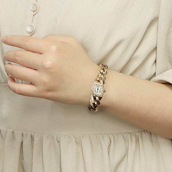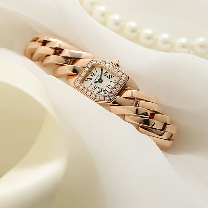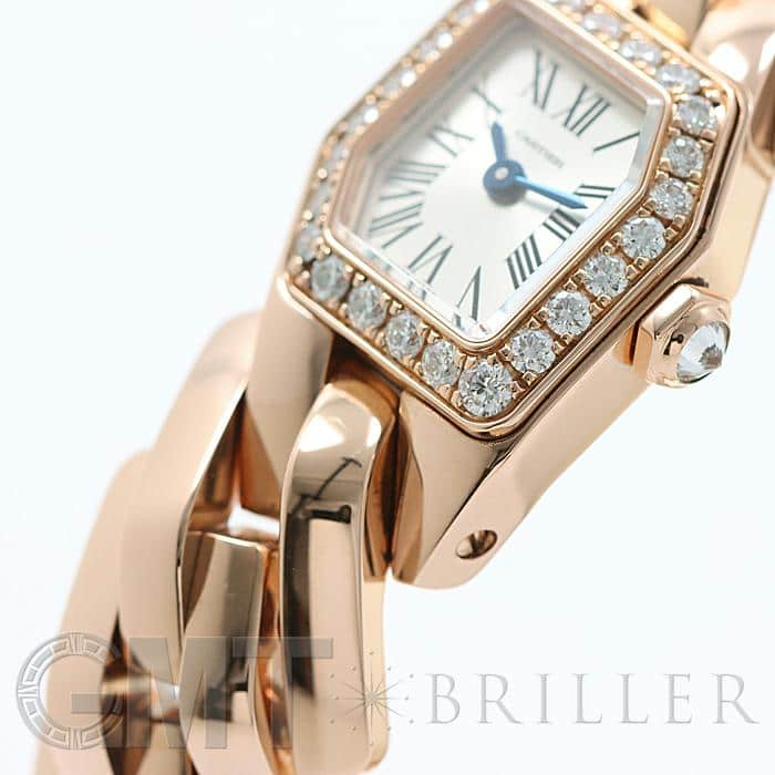 2020年に登場したカルティエの新作ジュエリーウォッチコレクション「マイヨン ドゥ カルティエ」。一目見ただけで忘れられないエッジの効いた新鮮なデザインが特徴です。 6角形のケースと文字盤に、レクタンギュラーのコマを組み合わせ、カルティエらしい幾何学的造形美を作り上げています。少しずつツイストされながら連なっているブレスレットは、ボリューム感溢れる立体的な美しさが楽しめ、重厚感のある着け心地はハイジュエリーのようです。特別な日をドラマティックに彩る腕時計です。生産数が少ない非常に珍しいモデルとなっておりますので、この出会いをお見逃しなく。