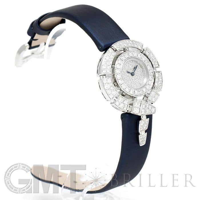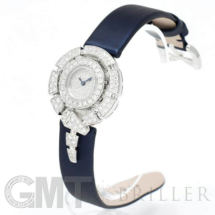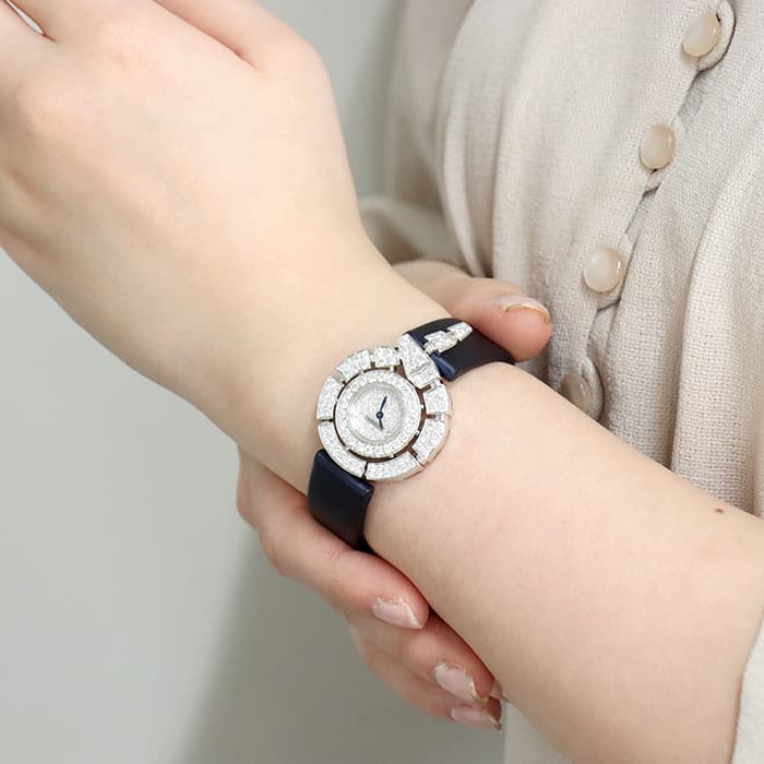 古代ローマやギリシャより、知性と生命力の象徴として装飾品のモチーフとなってきたスネークをデザインした「セルペンティ」。 従来のモデルは蛇が手首に巻きつくようなデザインになっておりましたが、2016年に発表された「セルペンティ インカンターティ」では、 ケース全体を蛇が包み込むようなデザインになっています。 ホワイトゴールドのケースには、ベゼルのみならず尾錠や文字盤全体にもダイヤモンドが敷き詰められ、繊細なサテンベルトとの組み合わせは、他にない美しさを醸し出します。