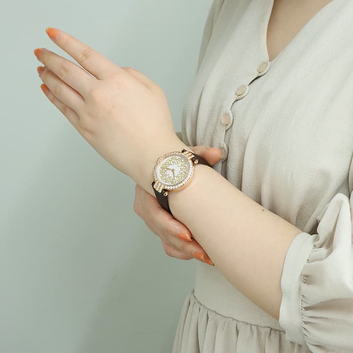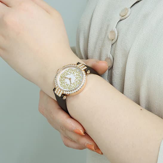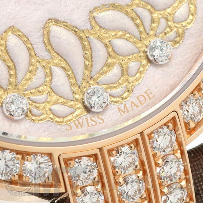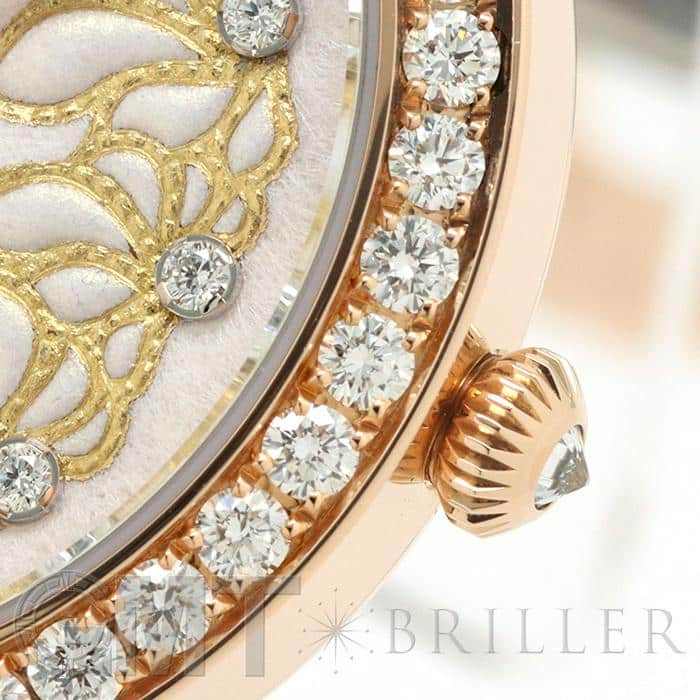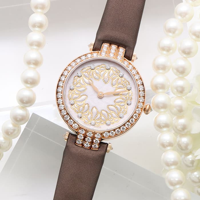 1932年に創業した「ハリー・ウィンストン」はジュエリーブランドとして名を広げ、 1989年に時計業界デビューを果たします。 記念すべきファーストコレクションとして登場し、ハリーウィンストンのアイコン的モデルとなっている「プルミエール」。ラグにデザインされた3つのアーチは、ニューヨーク5番街にあるハリー・ウィンストン本店のファサードから着想を得ています。 今回、ラグジュアリーなモデルという印象を残しながらも優しく温かみを感じる「PRNAHM36RR021」が入荷いたしました。 なんといってもこのモデルの一番の特徴は美しいダイアルでしょう。 ヨーロッパ王室の世界観からインスピレーションを得ており、生糸をダイアルに採用したその姿はまさに芸術的です。 インデックスやベゼル、ラグにセッティングされたダイヤモンドと合わさり、大変品と華やかさを感じる1本となっております。