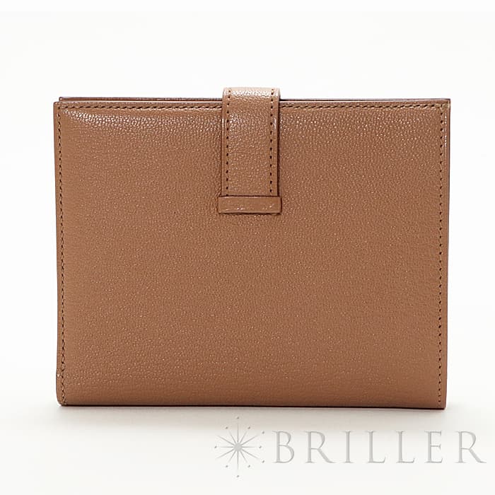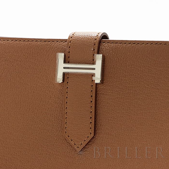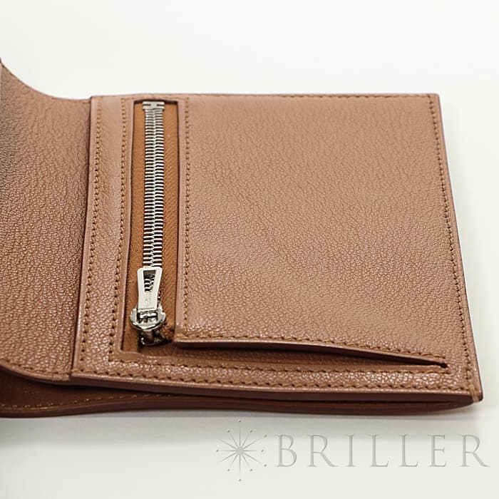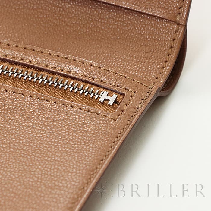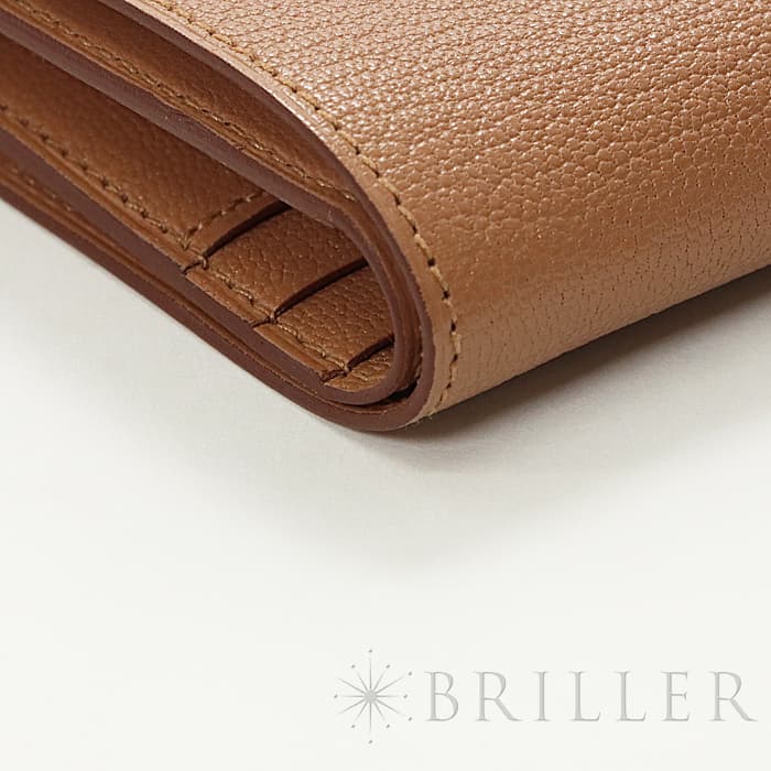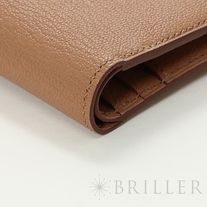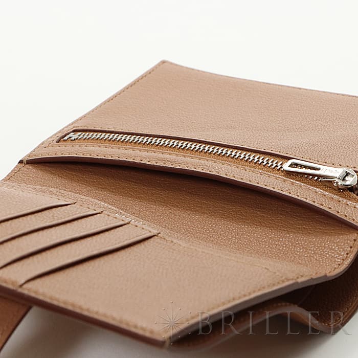 スモールレザーグッズの中でもエルメスの代名詞といえる「ベアン」シリーズ。フランス西部のベアン地方が由来です。エルメスの代表的なデザイン「Hマーク」の留め具が特徴的で、洗練されたシンプルなデザインの中に、エルメスらしい上質なラグジュアリー感を演出しています。ベアン コンパクトはカードケースと小銭入れがセットになっており、人気のミニバッグに対応できるほどよいサイズ感です。傷に強くて軽量な「シェーブル」は、艶やかな光沢感が美しく、エルメスの革小物によく使われ、発色が良いので「ケブラチョ」のまろやかなブラウンが際立っています。箱が通常のベアンコンパクトより大きいですが、中身はZ刻印(2021年)のお品物です。
