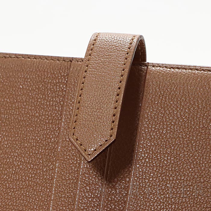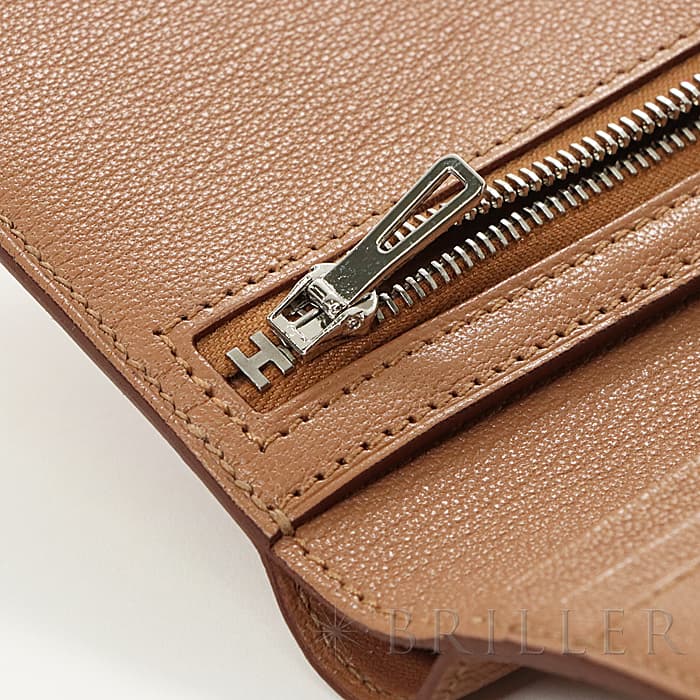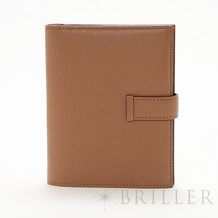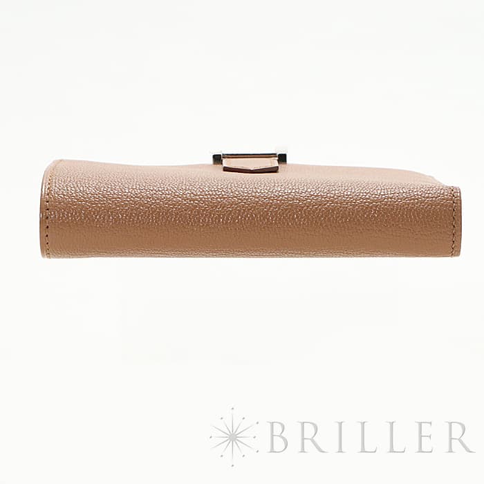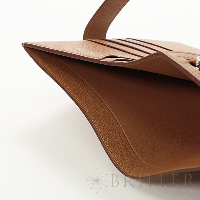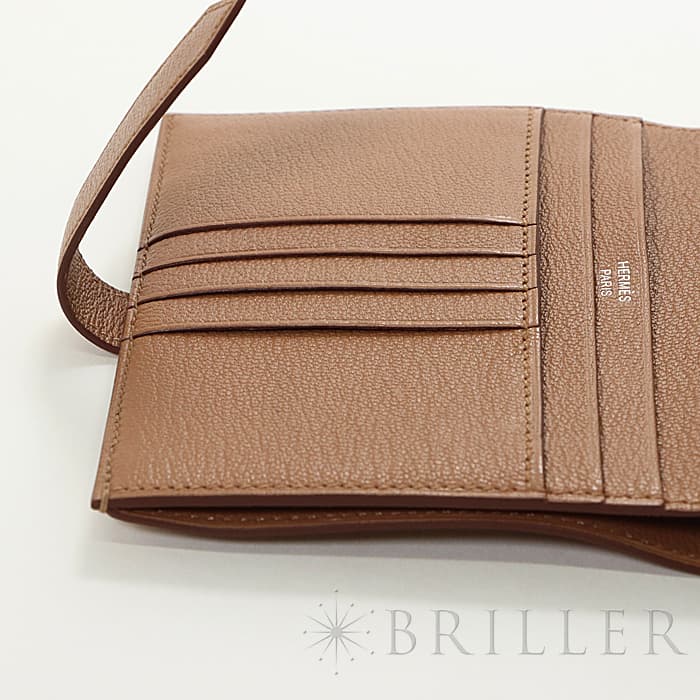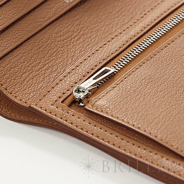 スモールレザーグッズの中でもエルメスの代名詞といえる「ベアン」シリーズ。フランス西部のベアン地方が由来です。エルメスの代表的なデザイン「Hマーク」の留め具が特徴的で、洗練されたシンプルなデザインの中に、エルメスらしい上質なラグジュアリー感を演出しています。ベアン コンパクトはカードケースと小銭入れがセットになっており、人気のミニバッグに対応できるほどよいサイズ感です。傷に強くて軽量な「シェーブル」は、艶やかな光沢感が美しく、エルメスの革小物によく使われ、発色が良いので「ケブラチョ」のまろやかなブラウンが際立っています。箱が通常のベアンコンパクトより大きいですが、中身はZ刻印(2021年)のお品物です。