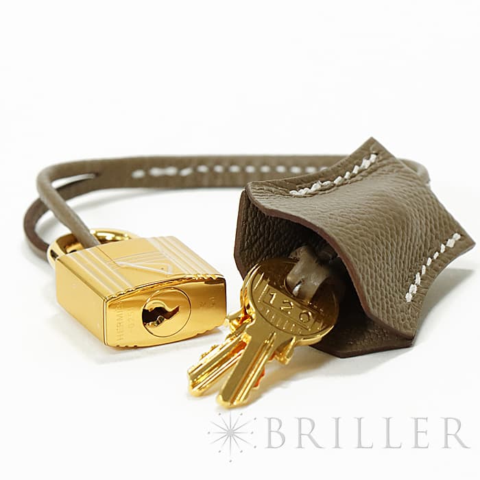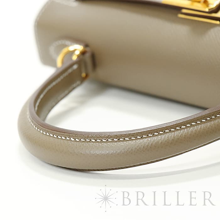 素材は「エプソン」で光沢のある雄仔牛レザーで、型崩れしにくいのも嬉しいポイントです。グレージュカラーの「エトゥープ」は、ブラウンとグレーの中間のような柔らかい色合いで、エレガントでありながらもかわいらしさを感じる大人のカラーです。ゴールド金具が凛とした雰囲気をさらに華やかに演出しています。ハンドバッグとして軽やかに、付属のショルダーを使えば肩に掛けるスタイルでもお楽しみいただけます。