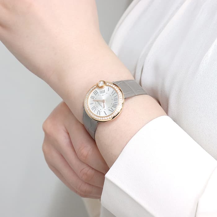 1847年にパリで創業した王族御用達の高級宝飾ブランド「カルティエ」は様々な時計を手掛けてきました。ピンクゴールドのラウンドケースにハイジュエラー「カルティエ」厳選のダイヤモンドを贅沢にセッティングした気品あふれる「バロン ブラン ドゥ カルティエ」が入荷いたしました。 丸みのあるフォルムに、シルバーのサンレイ仕上げの美しい文字盤にシルバーのインデックスがやさしく上品な雰囲気を演出しています。ベゼルにセッティングされた上質なダイヤモンドは、一粒大きくあしらわれており、輝きをより一層華やかに見せているラグジュアリーウォッチです。
