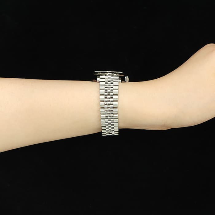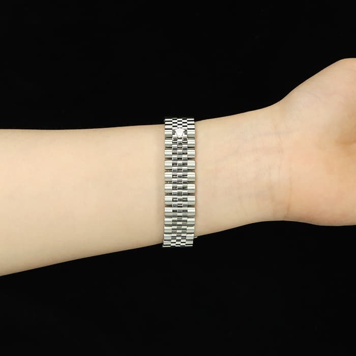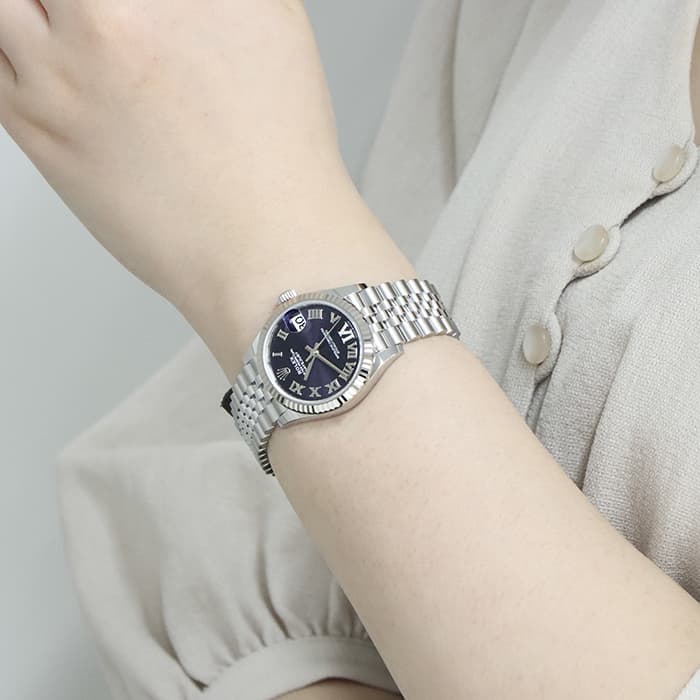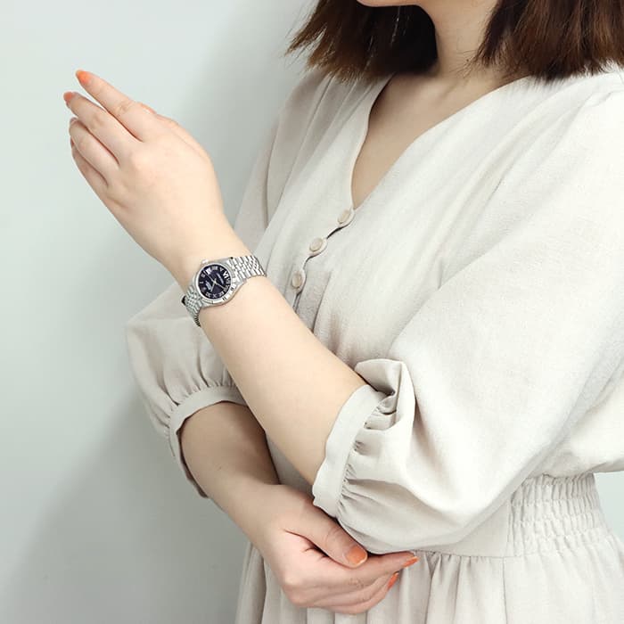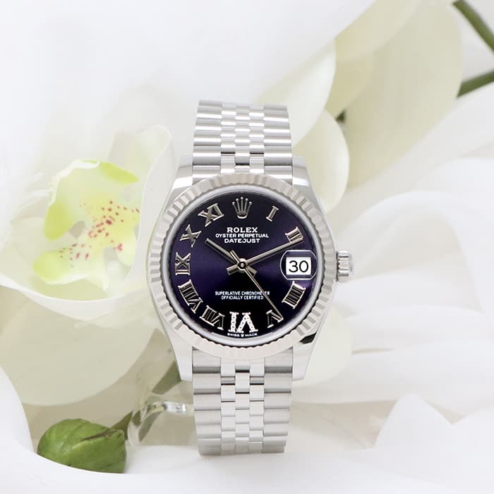 流行に左右されない普遍的なデザインで、男女問わず多くのファンに愛される「デイトジャスト」コレクション。ステンレスに上質な輝きのホワイトゴールドを組合わせることで、エレガントな雰囲気を演出しています。ケースサイズ31mmのデザインは時刻の読み取りやすさと、ジュエリーライクなデザインを兼ね備えていておすすめです。気品漂うオーベルジーヌ文字盤の6時位置の「VI」にさりげなくあしらわれたダイヤモンドが特別感を高めます。