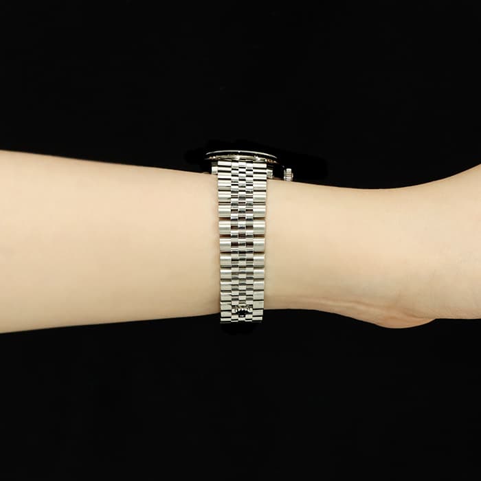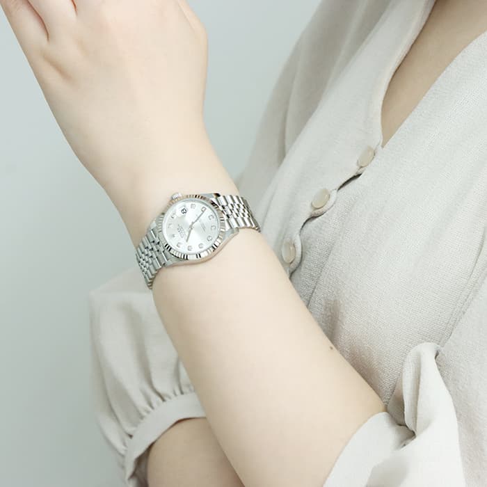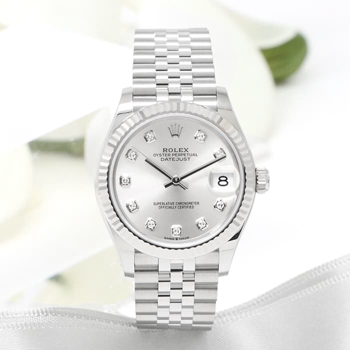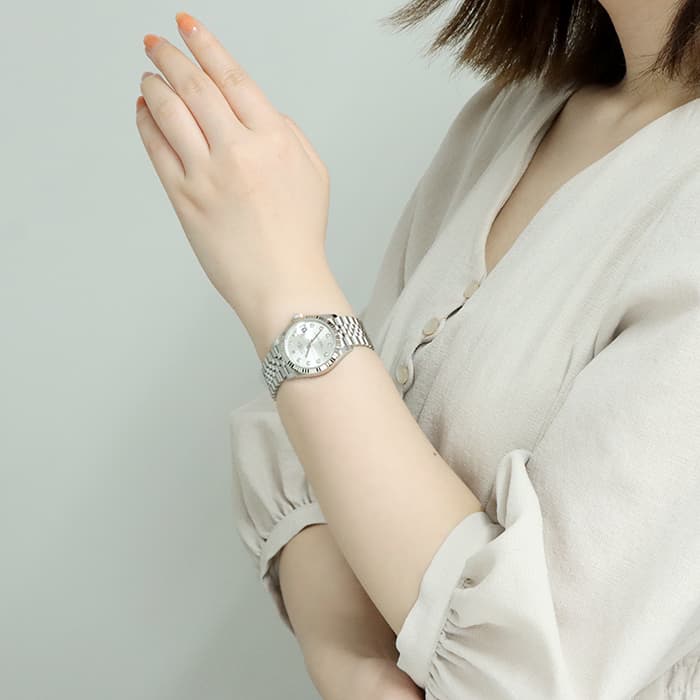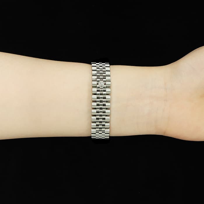 流行に左右されない普遍的なデザインで、男女問わず多くのファンに愛されるデイトジャストコレクション。ボーイズサイズの278274Gは、ケースサイズ31mmと女性が身に付ける腕時計としては大きめですが、フルーテッドベゼルにジュビリーブレスレットのドレッシーな組み合わせのデザインは、ボーイッシュになりすぎないマスキュリンな印象で、また時刻も読み取りやすいです。ステンレス×ホワイトゴールドのコンビ素材に、シルバー文字盤、ダイヤモンドインデックスを組合わせた爽やかで、装いを選ばず使いやすいデザインとなっています。