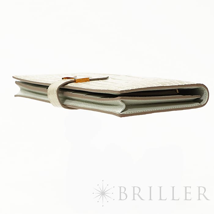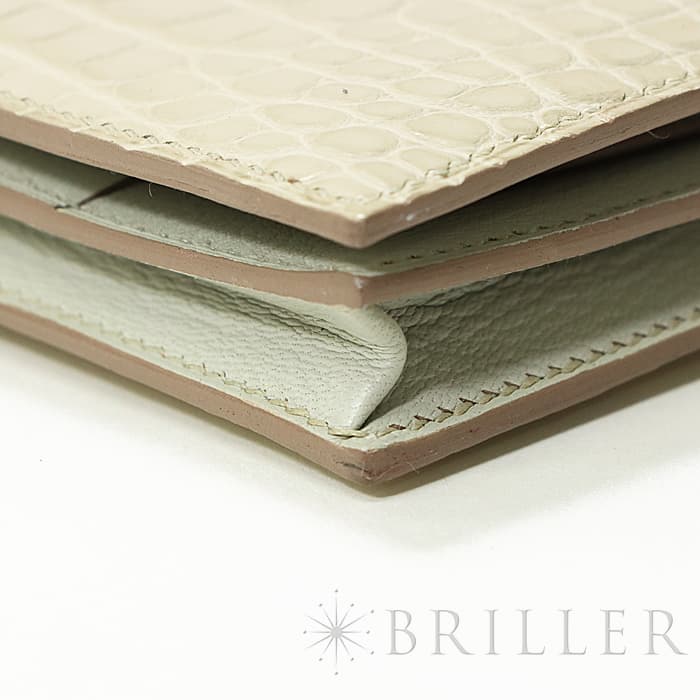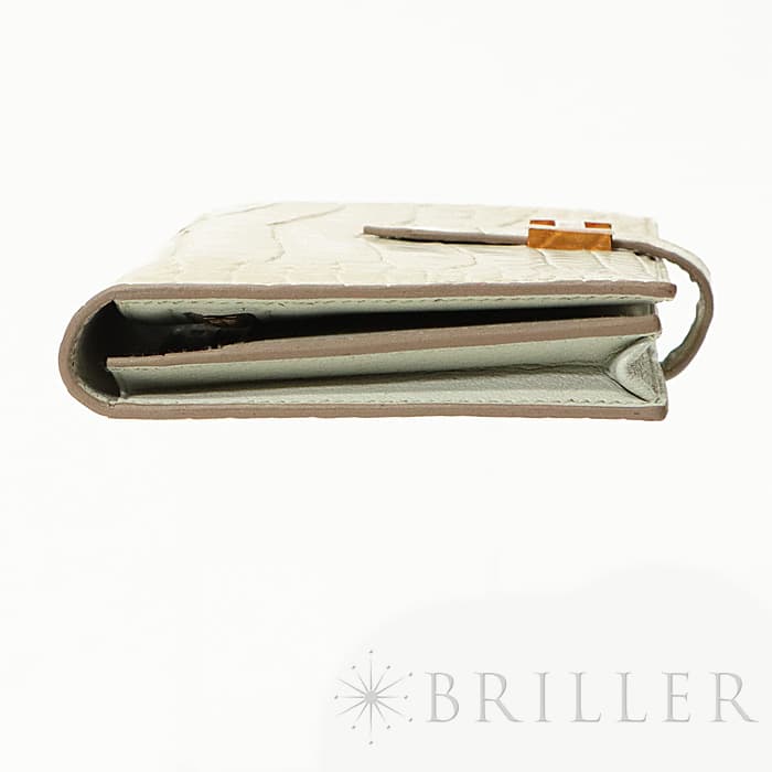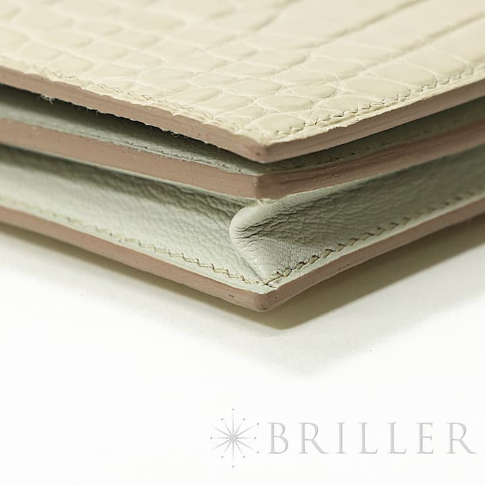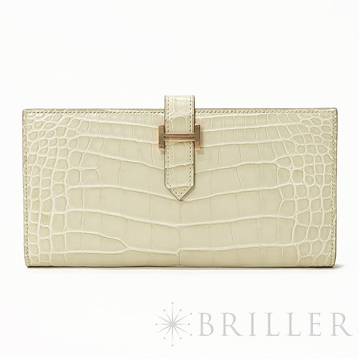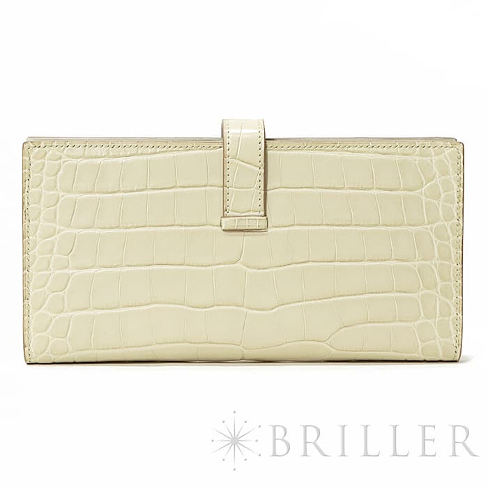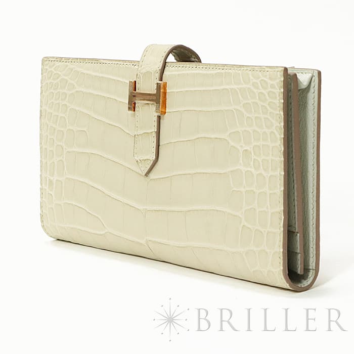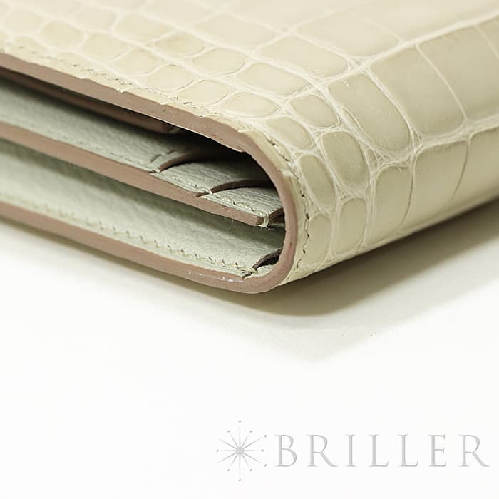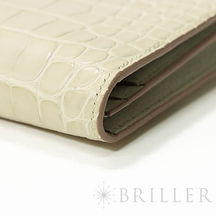 スモールレザーグッズの中でもエルメスの代名詞といえるベアンシリーズは、フランス西部の「ベアン」が由来で、エルメスの代表的なデザイン「Hマーク」の留め具がアイコンです。札入れ部分はマチ付きタイプとなり紙幣、チケットなどの収納に便利で、実用性の高さと上品さを兼ねそろえたラグジュアリーウォレットとなっております。アリゲーターマットの高級感あふれる質感に「ベトン」のグレーがかった美しいホワイトが映える逸品です。箱の横に黒い汚れがあります。金具にあたるクロコダイルの腑の境目が、金具に差し込む時にややめくれますので価格に反映しました。お財布は新品のD刻印(2019年)のお品物です。