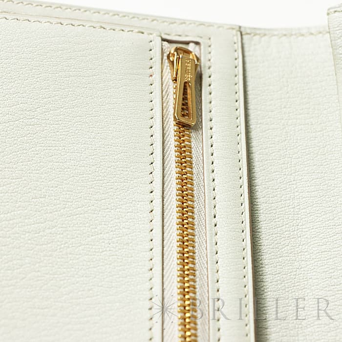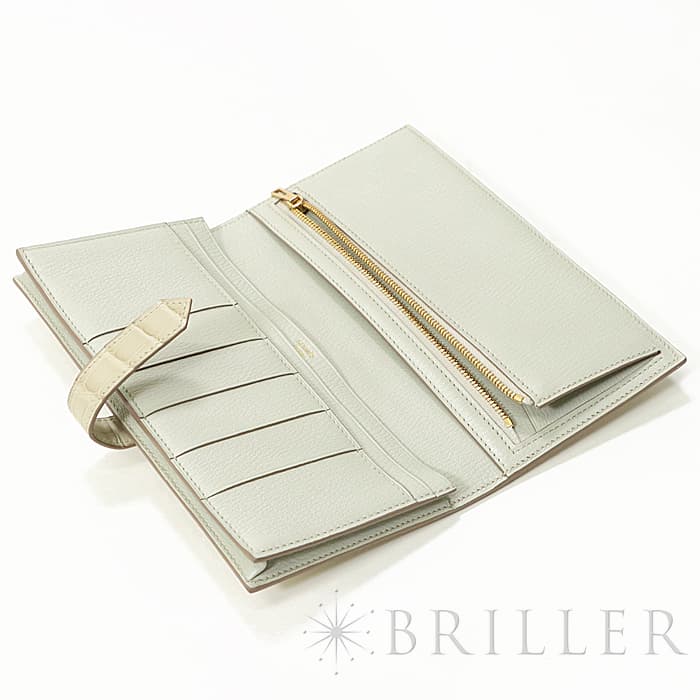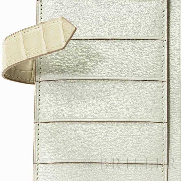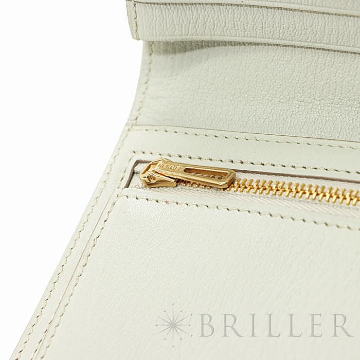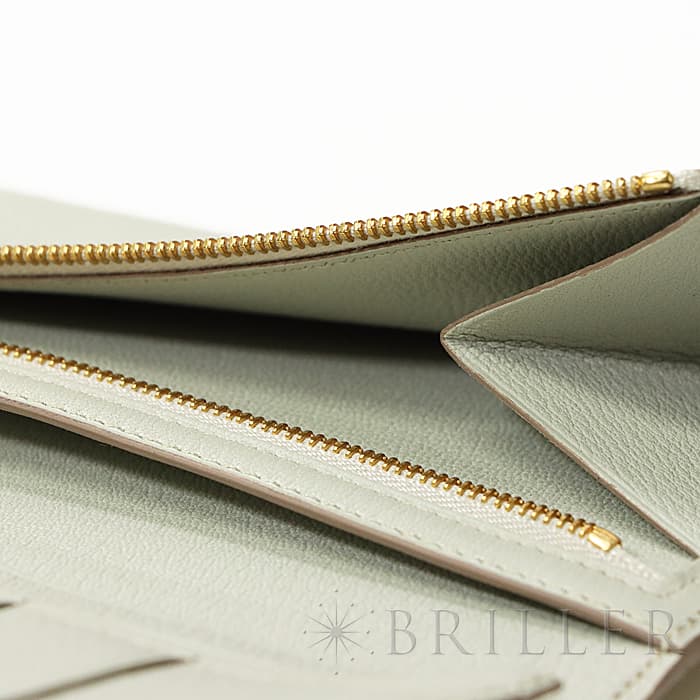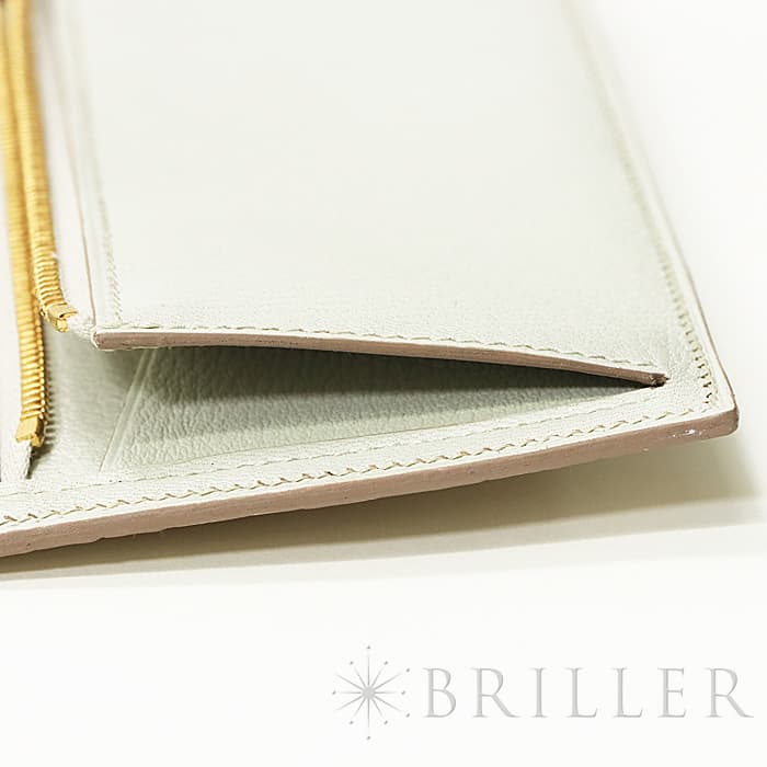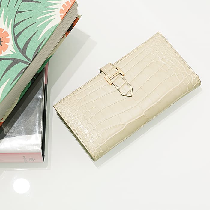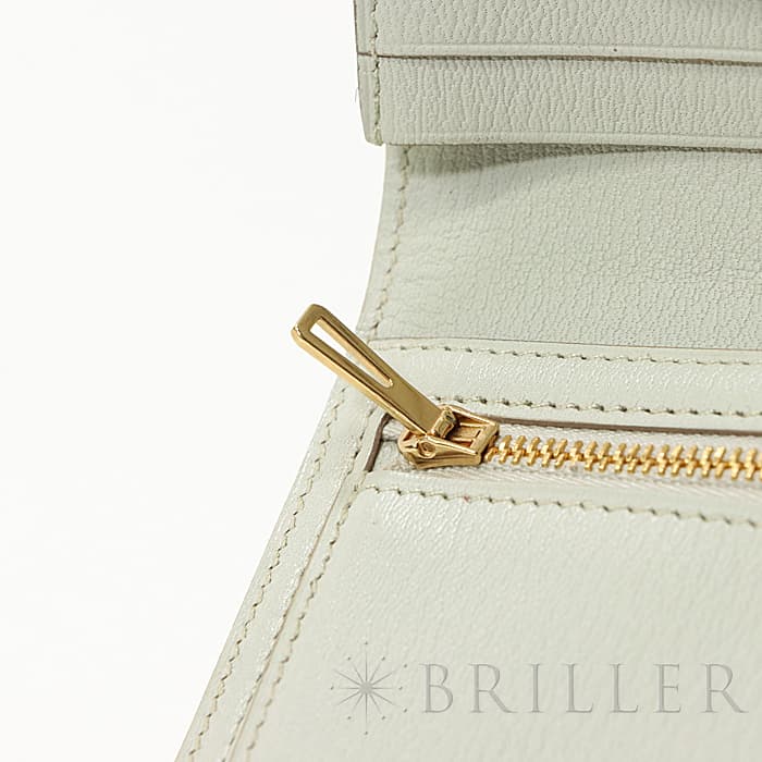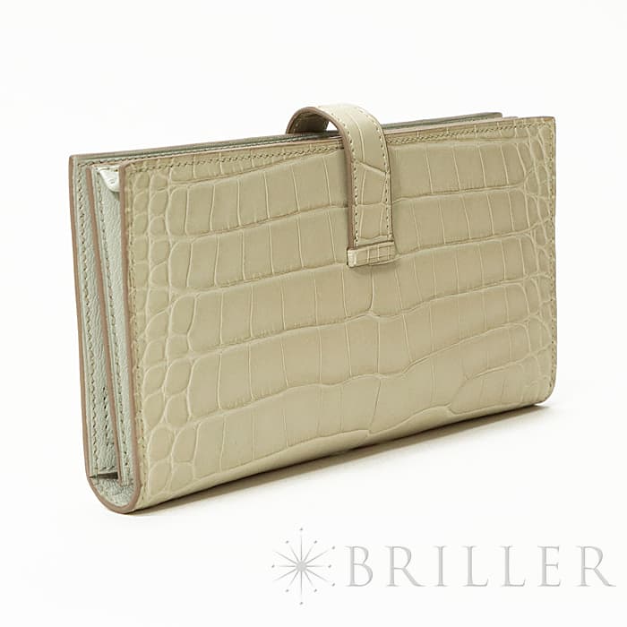 スモールレザーグッズの中でもエルメスの代名詞といえるベアンシリーズは、フランス西部の「ベアン」が由来で、エルメスの代表的なデザイン「Hマーク」の留め具がアイコンです。札入れ部分はマチ付きタイプとなり紙幣、チケットなどの収納に便利で、実用性の高さと上品さを兼ねそろえたラグジュアリーウォレットとなっております。アリゲーターマットの高級感あふれる質感に「ベトン」のグレーがかった美しいホワイトが映える逸品です。箱の横に黒い汚れがあります。金具にあたるクロコダイルの腑の境目が、金具に差し込む時にややめくれますので価格に反映しました。お財布は新品のD刻印(2019年)のお品物です。