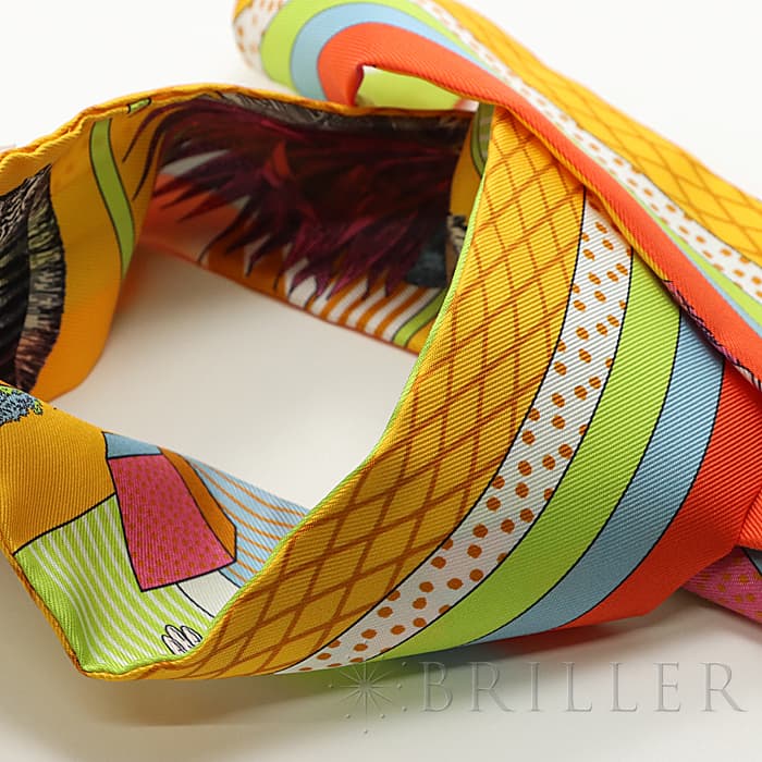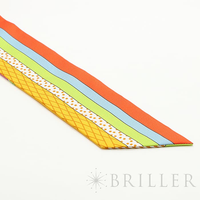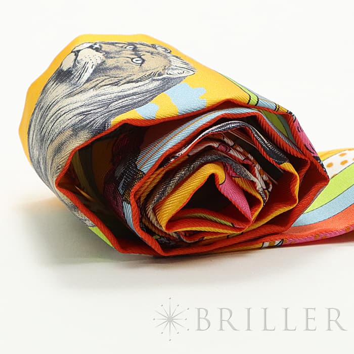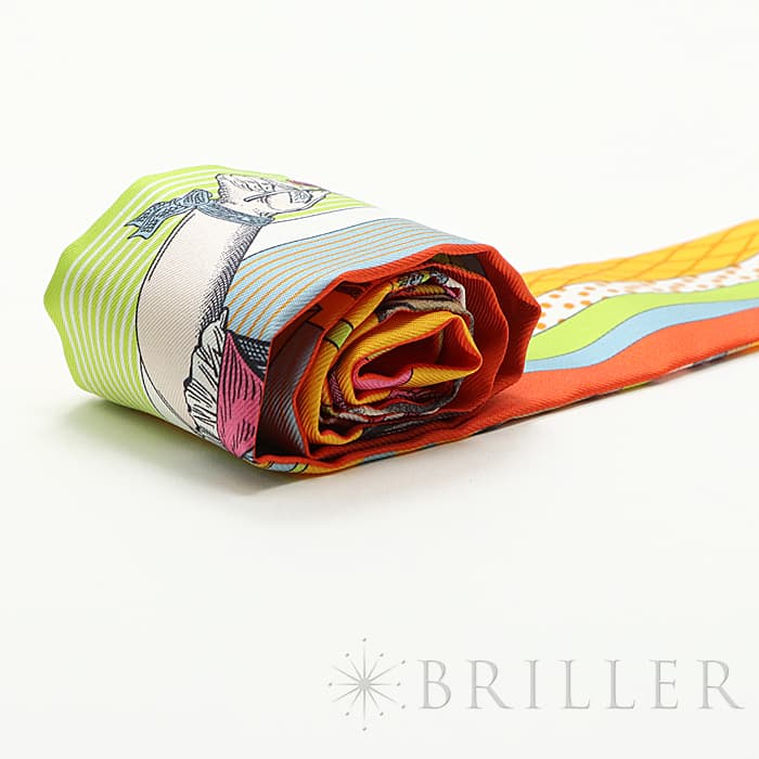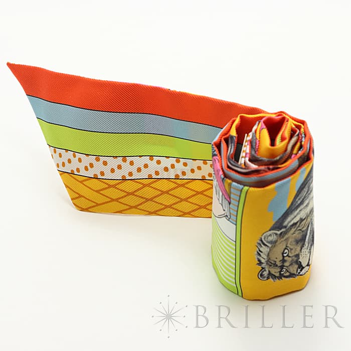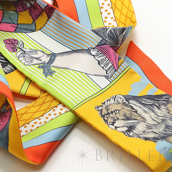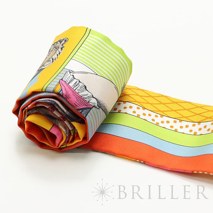 エルメスのシルクは優れた品質と、デザインに対しての情熱、ふんだんに取り入れた遊び心やユーモアがあふれております。1枚ごとにタイトルが決められており、「短く、的確で、輝きがある」をコンセプトに決められているそうです。 その中で「ツイリー」はバッグにとって貴重なアイテム。ハンドルにくるくると巻いてお使いいただくと、ガラリとお手持ちのエルメスの印象が変わります。マルチカラーなので、巻き方を変えて頂くと更に楽しみの幅が広がります。ハンドルの汚れ防止にも一役買いますし、もちろん自身のファッションにもお使いいただけます。ヘアバンドにしたり、首に巻いて頂いたりとユースフルな「ツイリー」を是非ご検討ください。