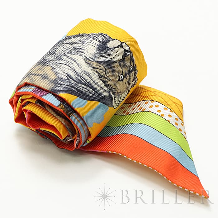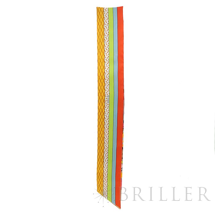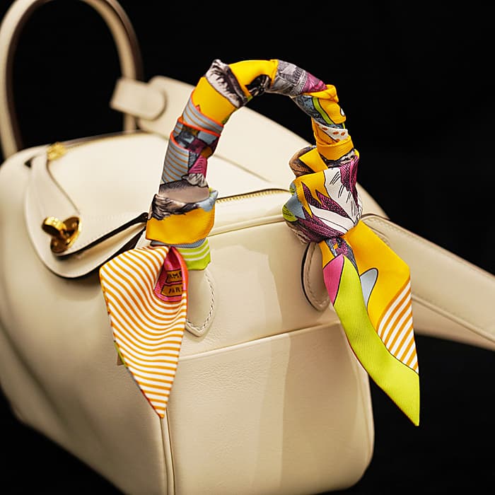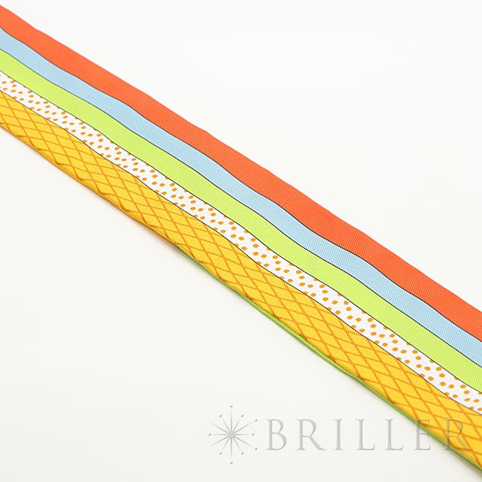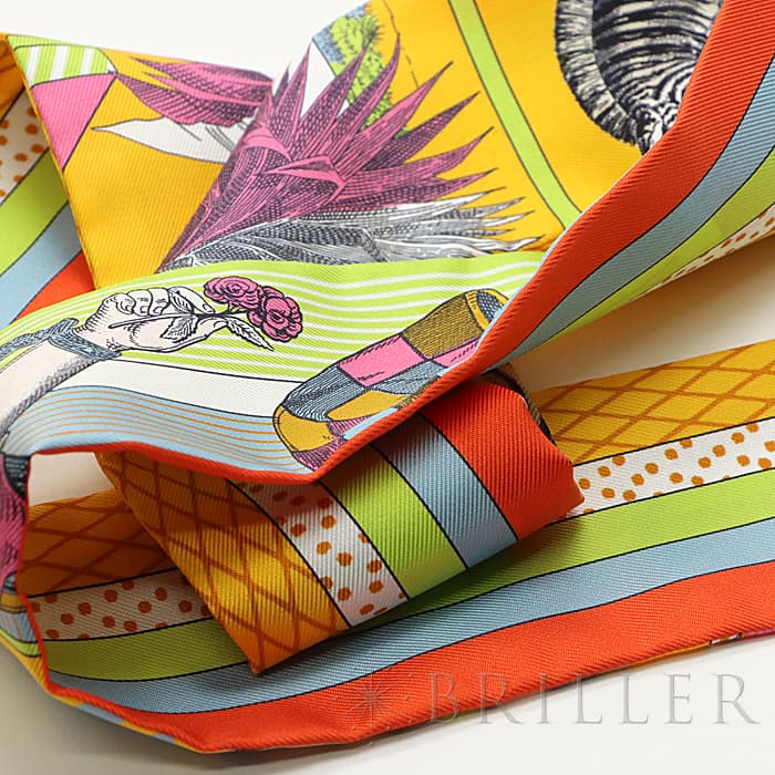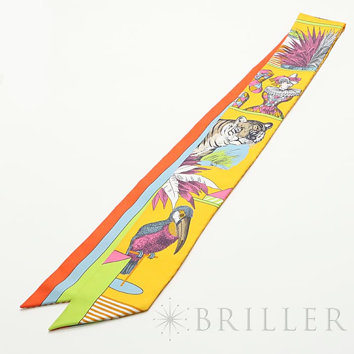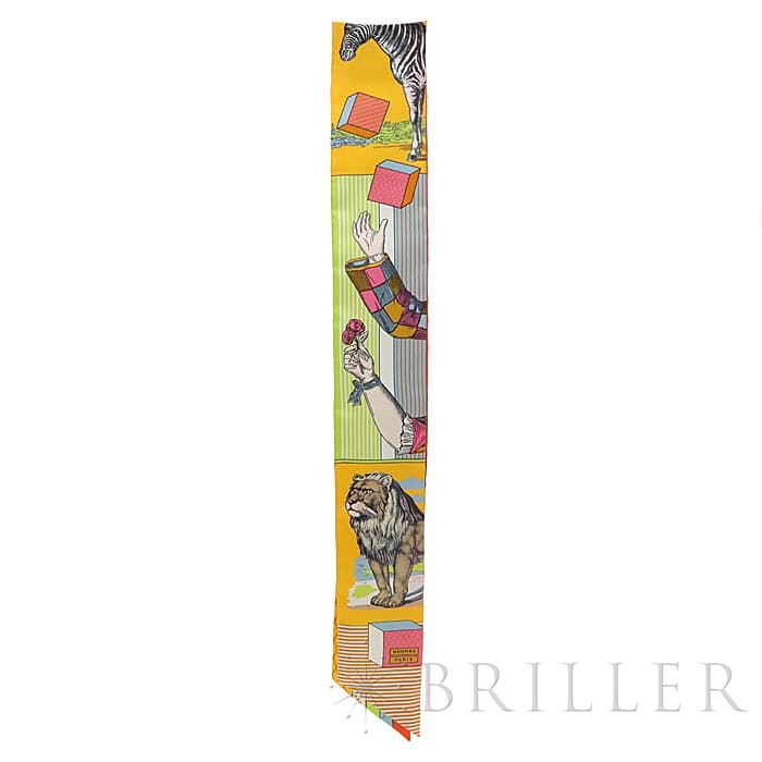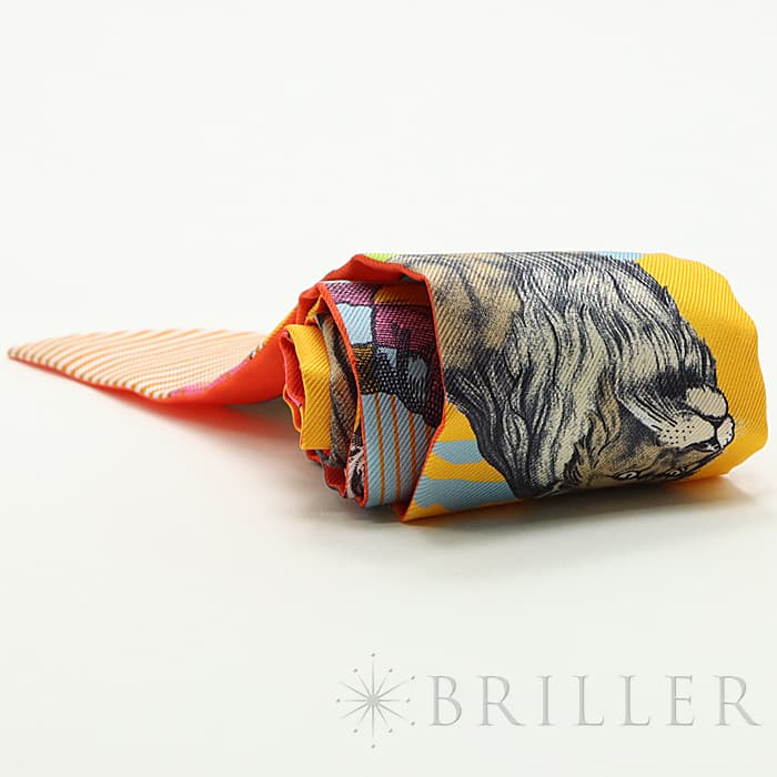 エルメスのシルクは優れた品質と、デザインに対しての情熱、ふんだんに取り入れた遊び心やユーモアがあふれております。1枚ごとにタイトルが決められており、「短く、的確で、輝きがある」をコンセプトに決められているそうです。 その中で「ツイリー」はバッグにとって貴重なアイテム。ハンドルにくるくると巻いてお使いいただくと、ガラリとお手持ちのエルメスの印象が変わります。マルチカラーなので、巻き方を変えて頂くと更に楽しみの幅が広がります。ハンドルの汚れ防止にも一役買いますし、もちろん自身のファッションにもお使いいただけます。ヘアバンドにしたり、首に巻いて頂いたりとユースフルな「ツイリー」を是非ご検討ください。