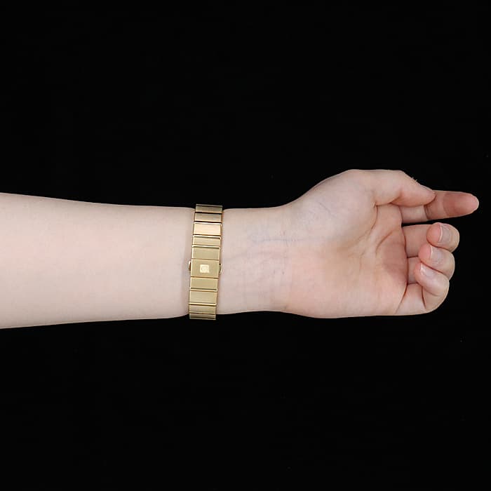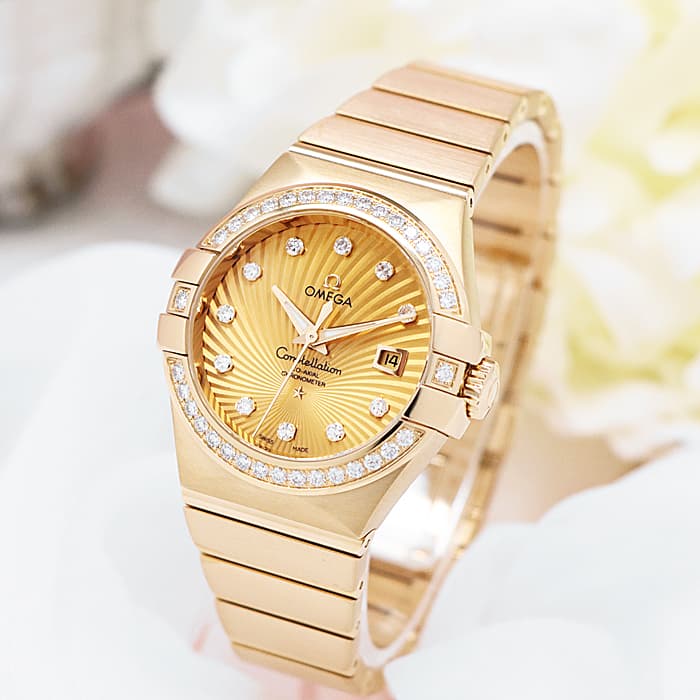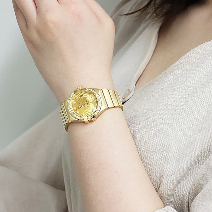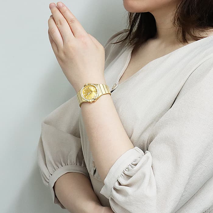 オメガを代表するレディースウォッチコレクションの「コンステレーション」は、ベゼルの4つの「爪」と、ケースからブレスレットまで流れるようなデザインで上品な雰囲気漂う腕時計です。123.55.31.20.58.001はコンステレーションの中でも、華やかなイエローゴールドを贅沢に使用したラグジュアリーラインとなっています。スーパーノヴァ模様を施したイエロー文字盤、ダイヤモンドを贅沢にセッティングしたベゼルとインデックスが格別にゴージャスです。ケースサイズは31mmと存在感がありますので、おしゃれのアクセントにもおすすめします。自分へのご褒美はもちろん、記念日の特別なプレゼントにもぜひご検討ください。