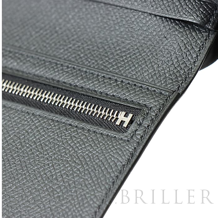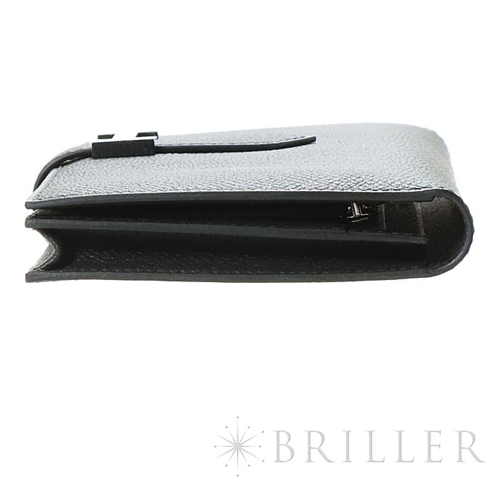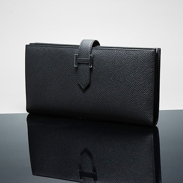 フランス西部の「ベアン」が由来の「ベアンスフレ」。その特徴はエルメスの代表的なデザイン「Hマーク」の留め具です。札入れ部分はマチ付きタイプとなり紙幣、チケットなどの収納に便利に使える実用性の高さと、上品さを兼ねそろえています。革、“H”の金具すべてがブラックを纏った「ベアンスフレ モノクローム」は、都会的で洗練された印象を漂わせる特別なお財布です。素材は型崩れしにくいヴォ―エプソンを使用しているので、美しい質感を長い間ご堪能いただけます。女性はもちろん、男性にもおすすめのラグジュアリーウォレットです。Z刻印(2021年)の新品のお品物です。