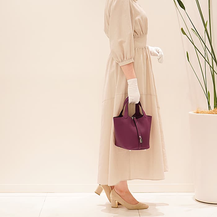 「トリヨンモーリス」は「トリヨンクレマンス」よりも目が細かく、ハリがある素材なので、デイリーにご利用いただいてもキズが付きにくいおすすめの素材です。 ほんのりマットな質感のトリヨンモーリスと、名前の通り、アネモネの花から着想を受けた艶やかな紫色が可愛い「アネモネ」の組み合わせは、キュートとミステリアスが共存する大人なピコタンとなっています。