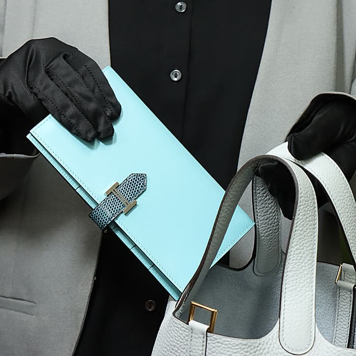 スモールレザーグッズの中でもエルメスの代名詞といえるベアンシリーズは、フランス西部の「ベアン」が由来で、エルメスの代表的なデザイン「Hマーク」の留め具がアイコンです。札入れ部分はマチ付きタイプとなり紙幣、チケットなどの収納に便利で、実用性の高さと上品さを兼ねそろえたラグジュアリーウォレットとなっております。 「ベアンクラシック」は誕生当初から販売され続けているデザインです。こちらは素材に滑らかな「タデラクト」と、ラグジュアリーな「リザード」を組合わせています。 手に持つだけでお買い物が楽しくなるような逸品です。A刻印(2017年)のお品物です。