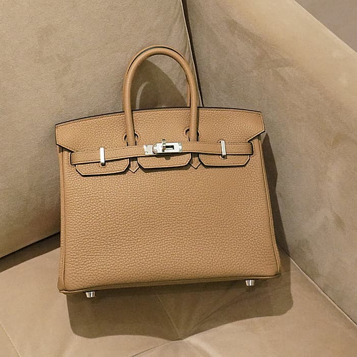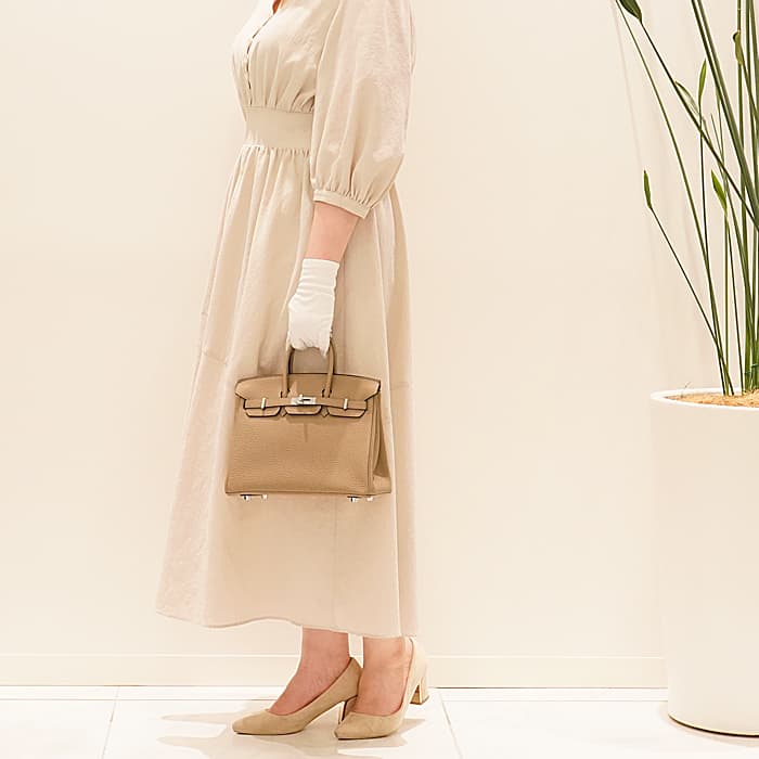 「バーキン」の由来は女優の「ジェーン・バーキン」が航空機でエルメスの社長と出会い、物があふれかえりそうになっている彼女のバッグを見て、収納がたくさんできるバッグとして創られました。整理せず物を入れることができる秀逸な「バーキン」は全世界で愛されています。25サイズはやや小ぶりなサイズ感が特徴で、ミニ財布やポーチなど外出時に必要最低限の持ち物でお出かけされる方に大変おすすめです。手持ちにちょうどよいサイズ感がエレガントな雰囲気に決まります。