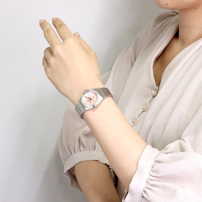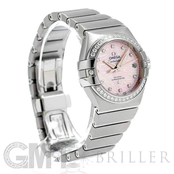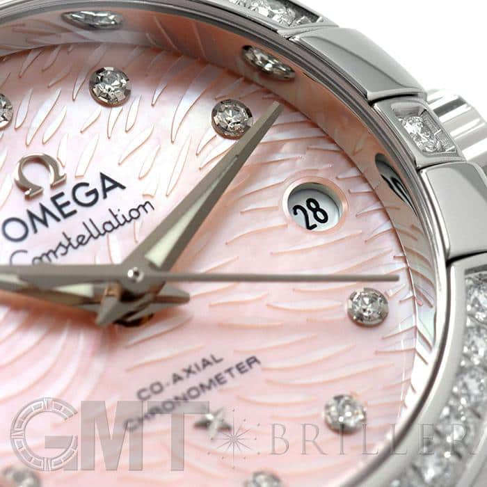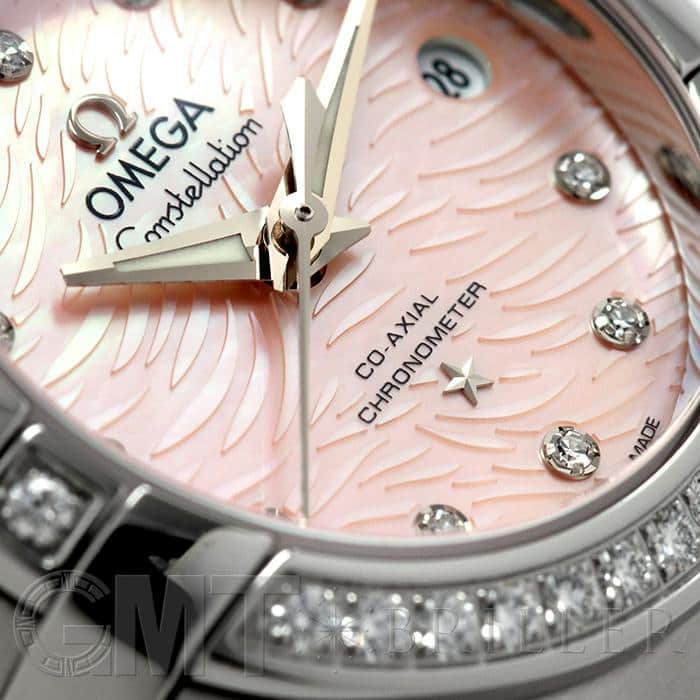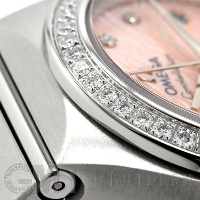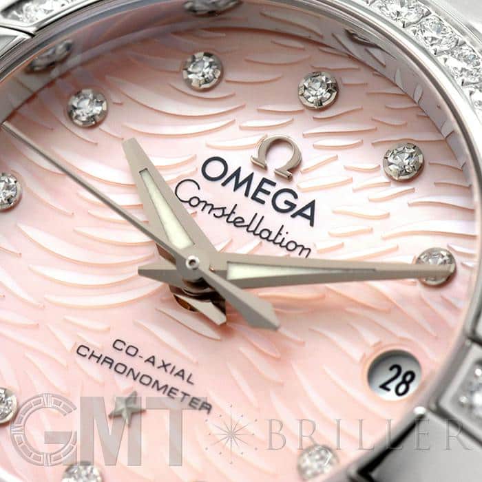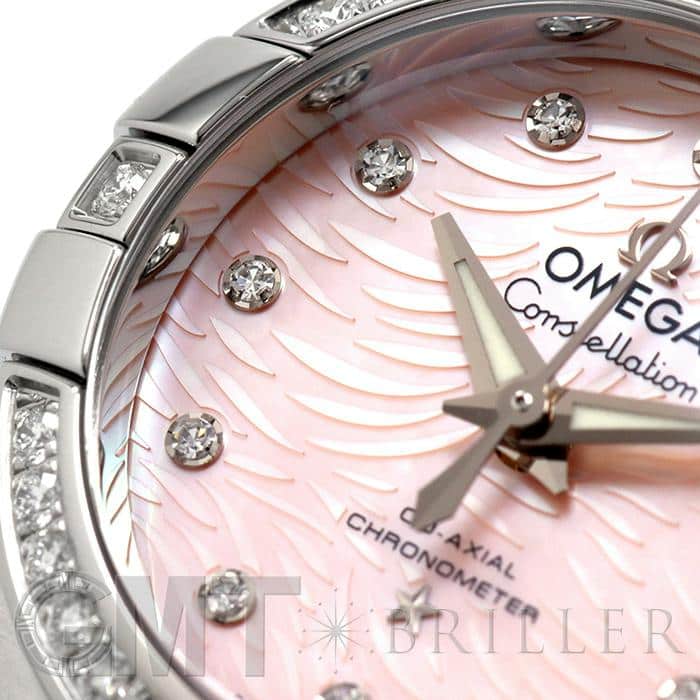 2014年に誕生した「コンステレーション プリュム」は、シェル文字盤に羽をイメージした柔らかな曲線を施した文字盤がドラマティックなシリーズです。ケースサイズは27mmで、素材はデイリーに使いやすいステンレスを使用しており、ライトコーラルマザーオブパールのフェミニンな印象と、ベゼルのダイヤモンドが高級感を生み出しています。ムーブメントにはオメガが誇るコーアクシャルクロノメーターのCal.8520を搭載しています。裏蓋がシースルーになっているため、機械式時計を視覚的にもお楽しみいただけます。自分へのご褒美や大切な方へのプレゼントにぜひご検討ください。