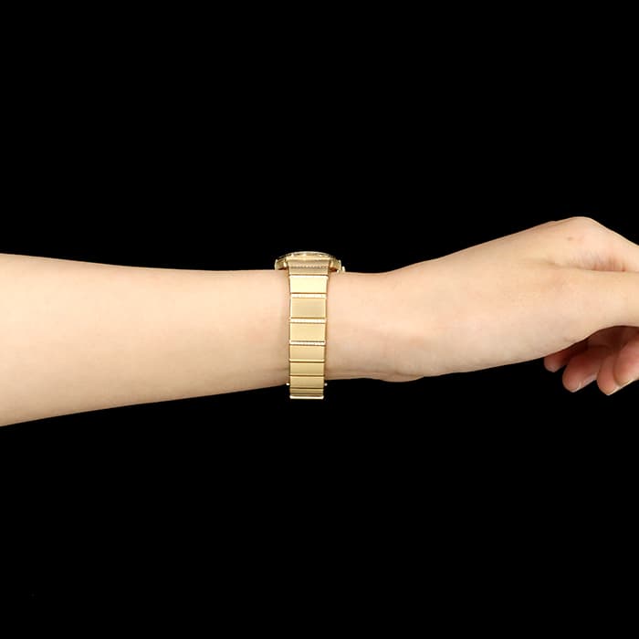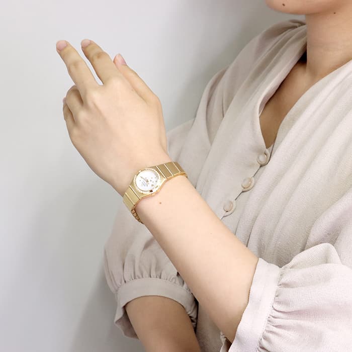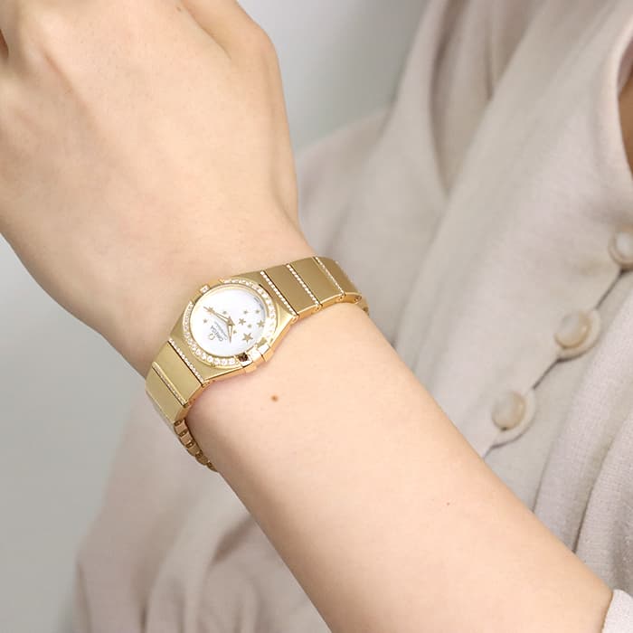 文字盤に星(スター)を散りばめたドラマティックな「コンステレーション 123.55.24.60.05.002」。 ケースサイズは小さ目の24mmで、ジュエリーライクな印象が高まります。ゴールド無垢のデザインの中でも、ベゼルからブレスレットまで、贅沢にダイヤモンドをセッティングした123.55.24.60.05.002 は、コレクションの中でもハイクラスにゴージャスな1本です。 クォーツ式(電池)なので取り扱いしやすくなっています。自分へのご褒美や大切な方へのプレゼントにぜひご検討ください。