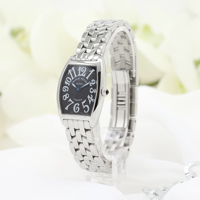1992年のブランド創業からフランクミュラーを代表するモデル「トノーカーベックス」。 ケースの滑らかな曲線が手首に絶妙なフィット感を与え、美しいラインを見せてくれます。 アールデコ様式をモチーフとした優雅なデザインと、独特な文字盤が女性らしい輝きを放ちます。こちらのブラックダイヤルのブレスレッドモデルは、シックでエレガントな印象を与えてくれるのでフォーマルからカジュアルまで、さまざまなシーンで活躍するレディースウォッチです。