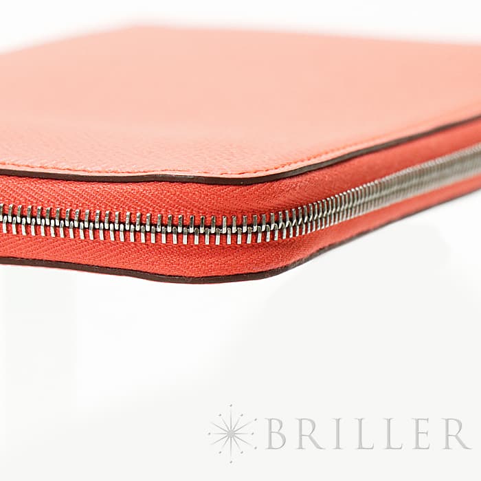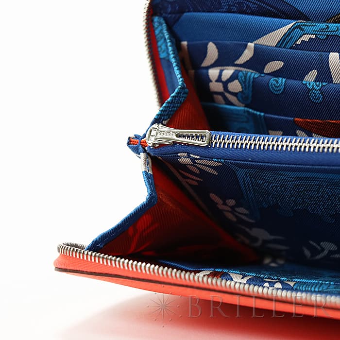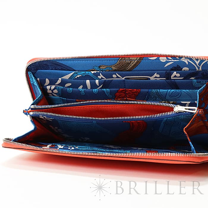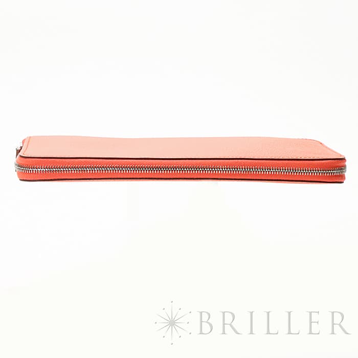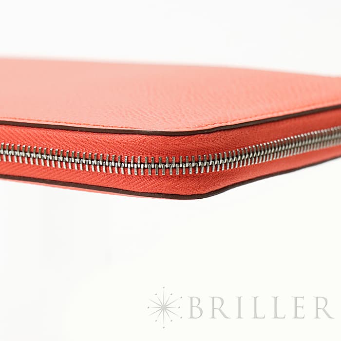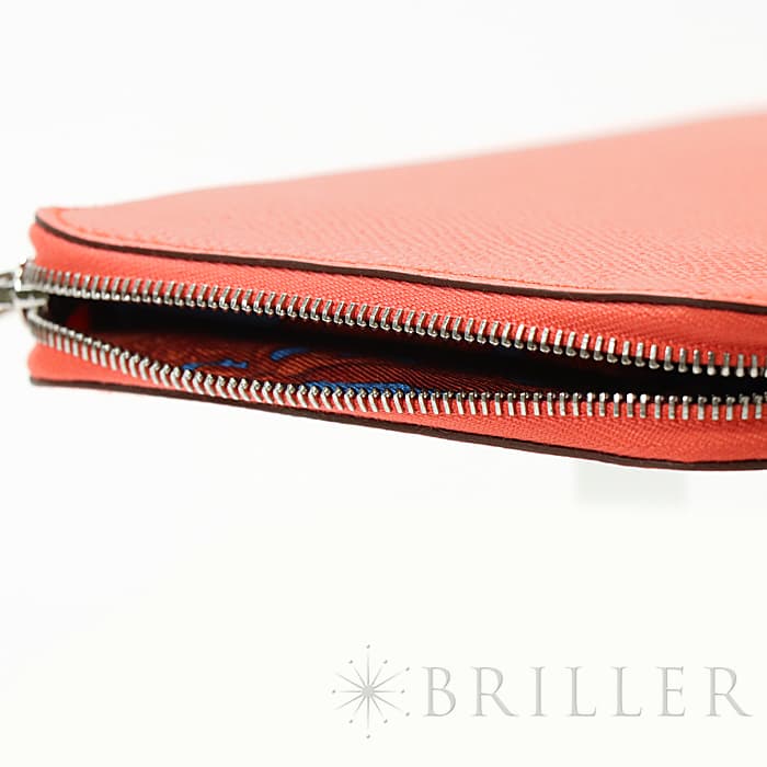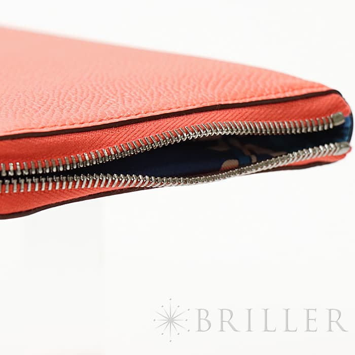 角が丸みを帯びたシンプルな長方形のデザインに、ラウンドファスナーが組み合わさった「アザップ」。エルメスのお財布の中でも、すっきりとして上品なフォルムが人気のコレクションで、「シルクイン」は内側にカレと同じシルク生地があしらわれた美しいアイテムです。内側にはカードポケットが合計12、中央に小銭入れが付いています。約1.5cmの厚さは女性の手でも持ちやすく、バッグの中でもかさばりにくいサイズ感です。オレンジがかったビビットピンクの「ローズテキサス」に、シルバー金具を合わせることで、大人の女性でも使いやすい洗練された印象に仕上がっています。中は爽やかなブルーを基調としたシルクが使用されていて、上品で可愛らしい印象が楽しめます。デザイン性だけでなく、機能性もすぐれたおすすめのロングウォレットです。Z刻印(2021年)のお品物です。