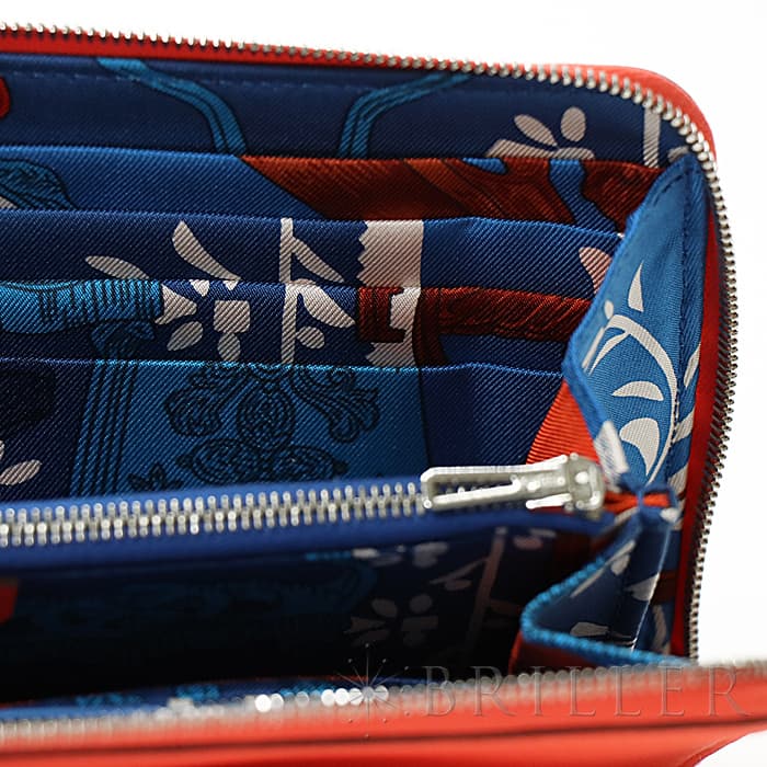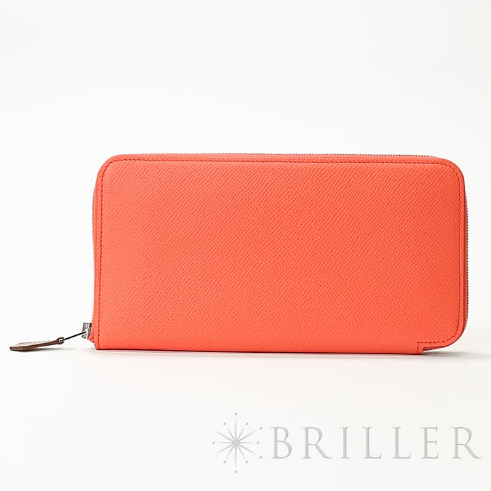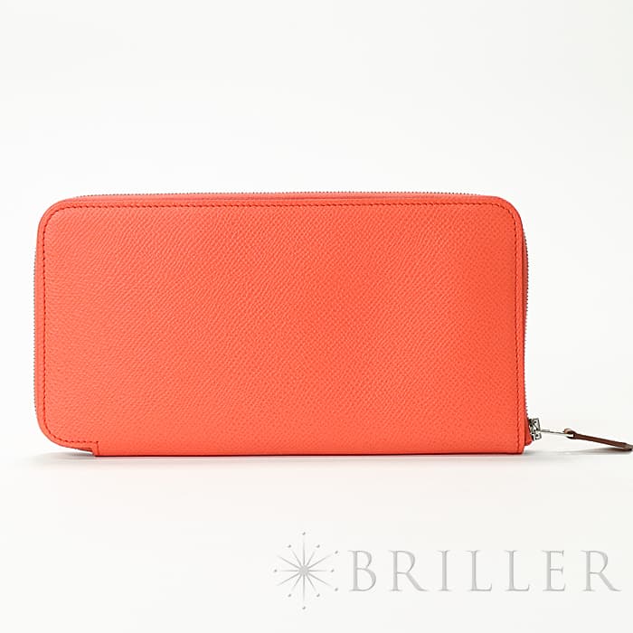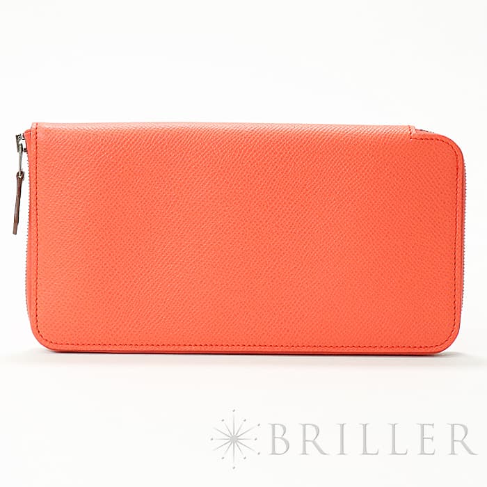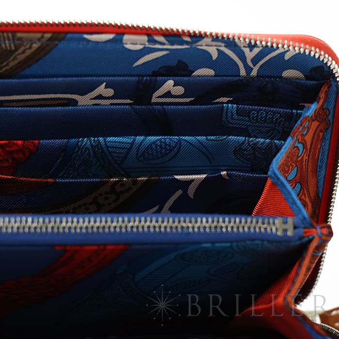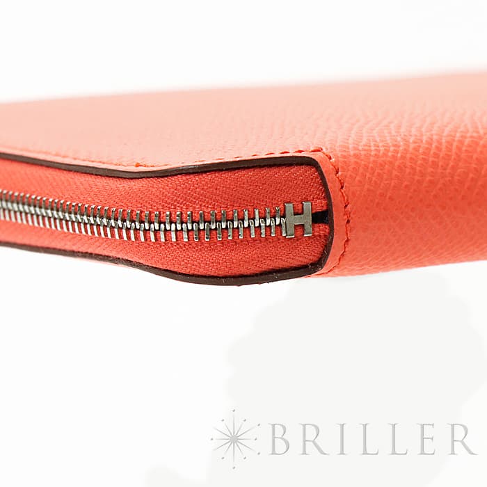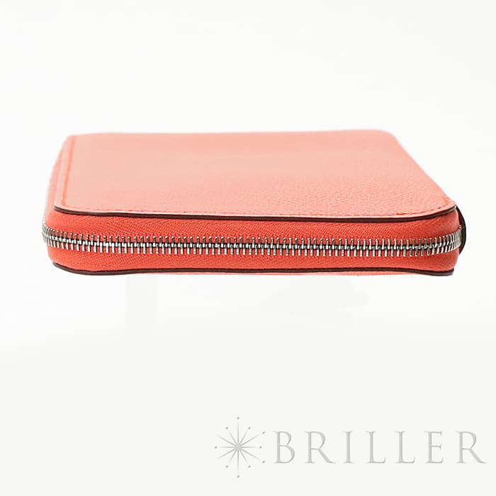角が丸みを帯びたシンプルな長方形のデザインに、ラウンドファスナーが組み合わさった「アザップ」。エルメスのお財布の中でも、すっきりとして上品なフォルムが人気のコレクションで、「シルクイン」は内側にカレと同じシルク生地があしらわれた美しいアイテムです。内側にはカードポケットが合計12、中央に小銭入れが付いています。約1.5cmの厚さは女性の手でも持ちやすく、バッグの中でもかさばりにくいサイズ感です。オレンジがかったビビットピンクの「ローズテキサス」に、シルバー金具を合わせることで、大人の女性でも使いやすい洗練された印象に仕上がっています。中は爽やかなブルーを基調としたシルクが使用されていて、上品で可愛らしい印象が楽しめます。デザイン性だけでなく、機能性もすぐれたおすすめのロングウォレットです。Z刻印(2021年)のお品物です。
