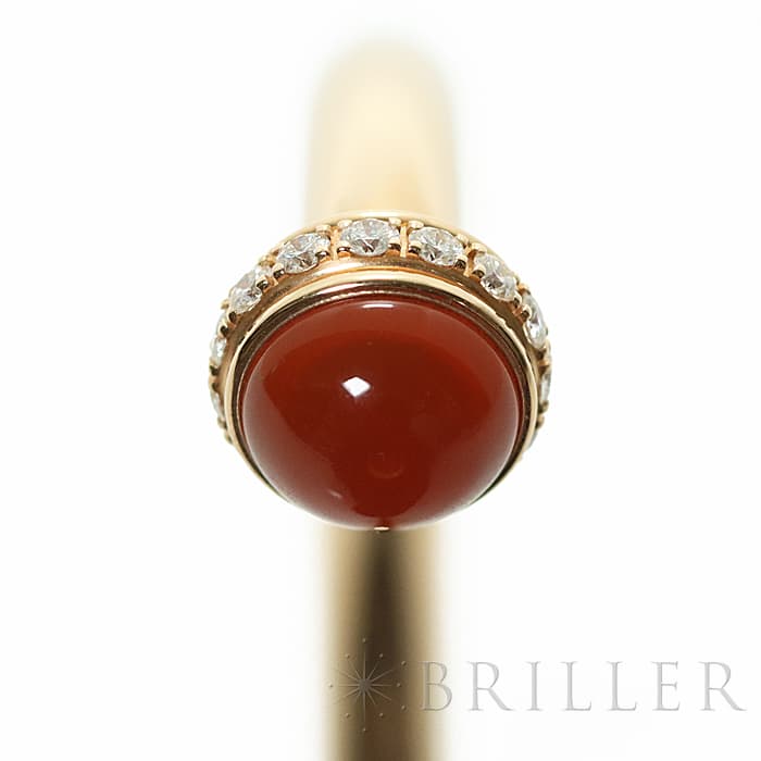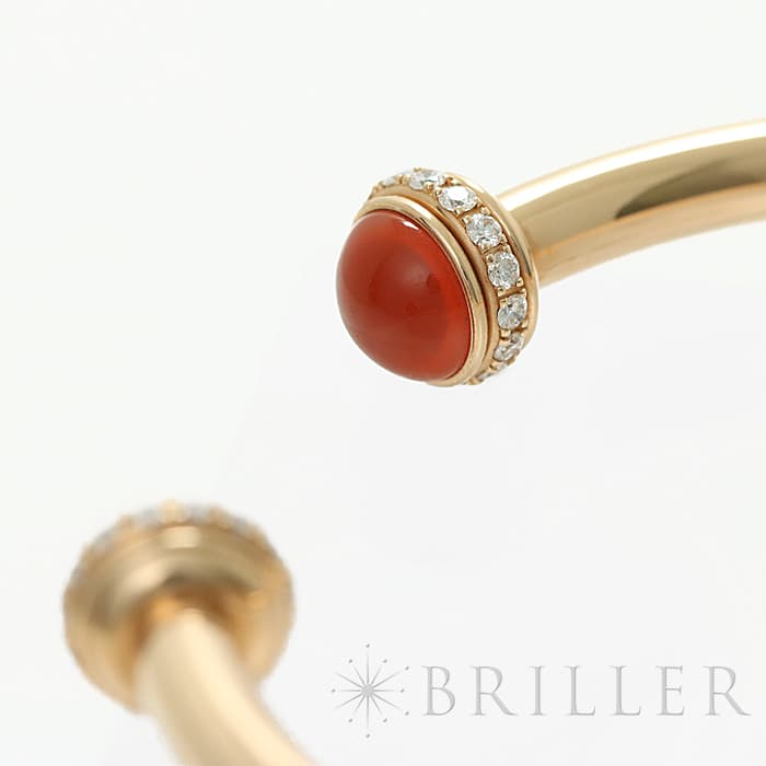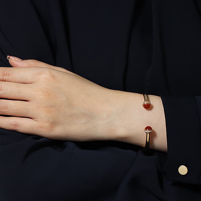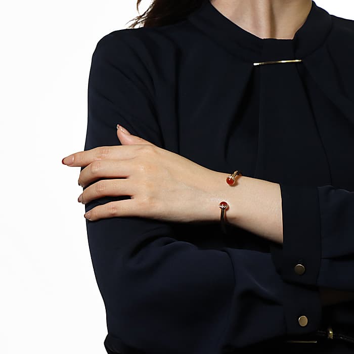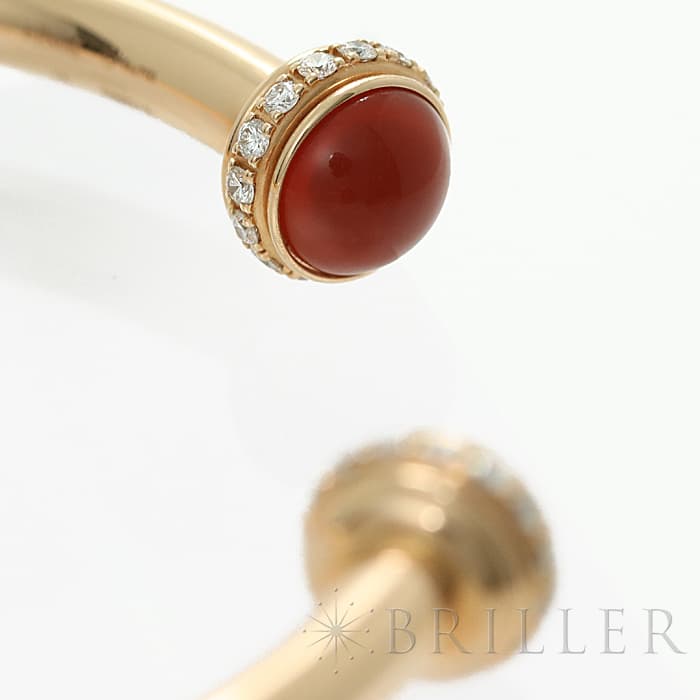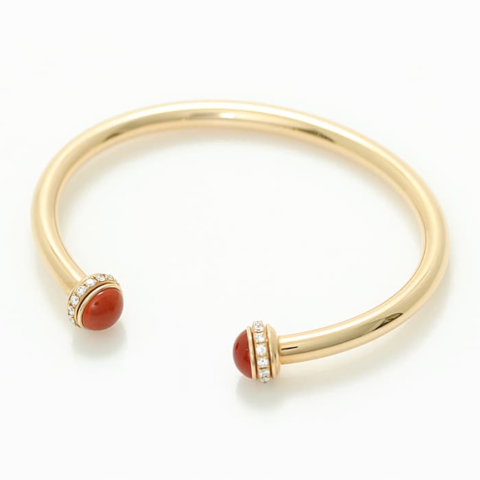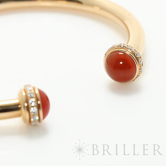 高い美意識をもったスイスのブランド、ピアジェ。丸みのある外側の回転するリングが特徴的で、ダイヤモンドが華やかな雰囲気を漂わせます。ピンクゴールドなため、肌馴染みがよく、両端の丸い赤いカーネリアンが印象的なバングルです。