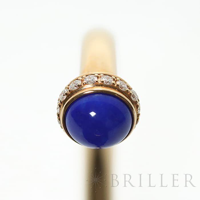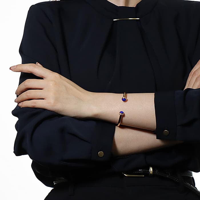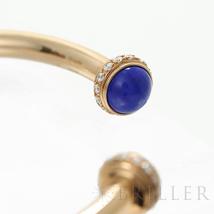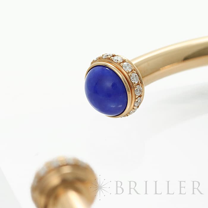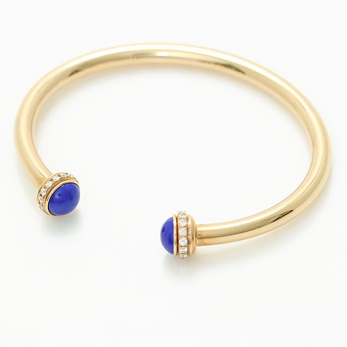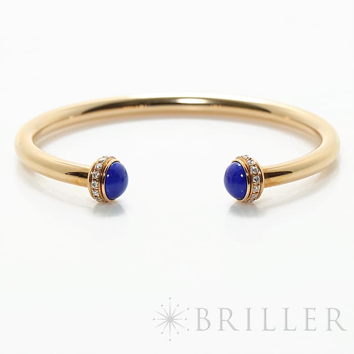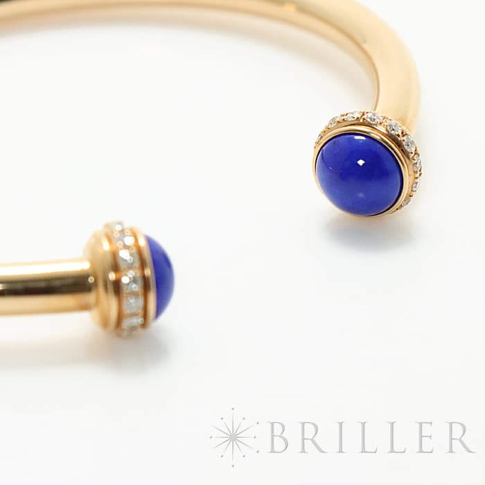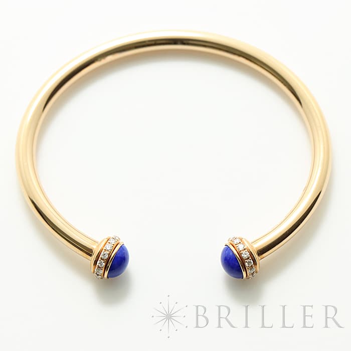 高い美意識をもったスイスのブランド、ピアジェ。丸みのある外側の回転するリングが特徴的で、ダイヤモンドが華やかな雰囲気を漂わせます。ピンクゴールドなため、 肌馴染みがよく、両端の丸いラピスラズリが印象的なバングルです。