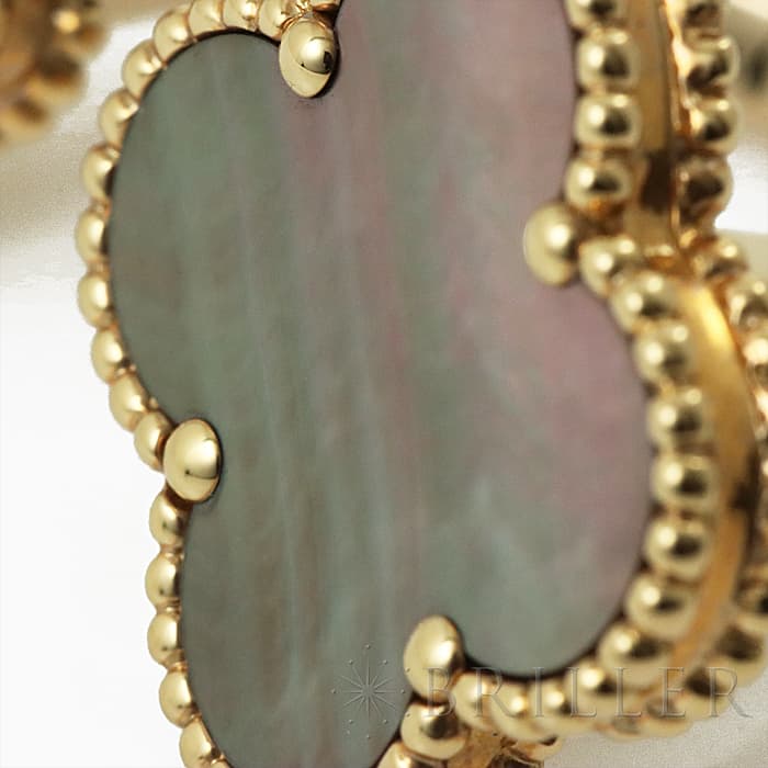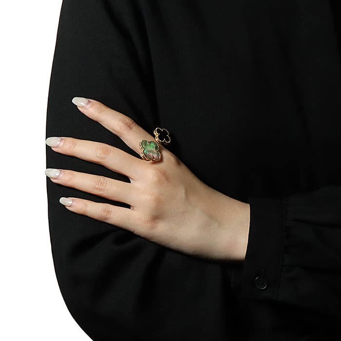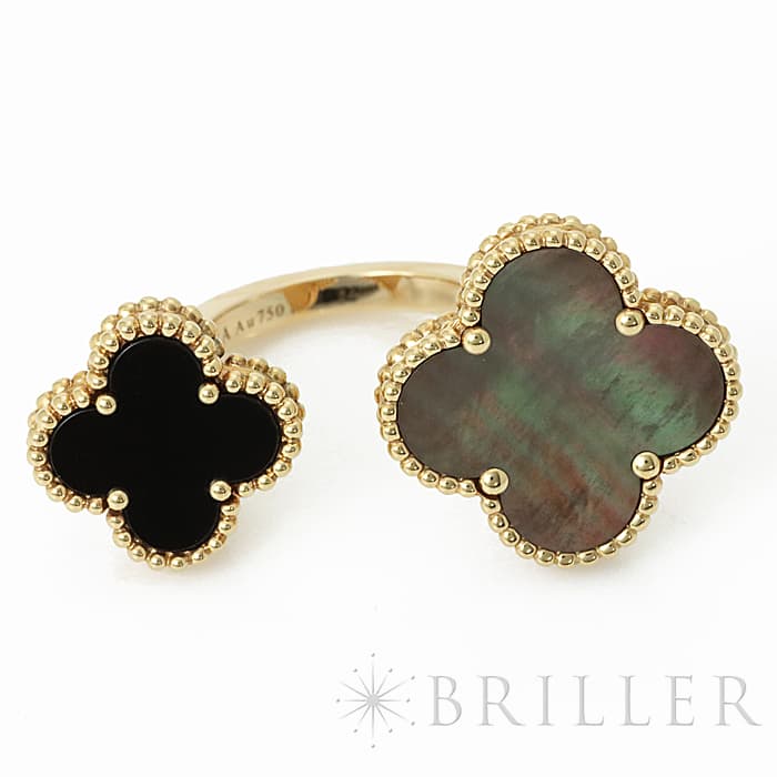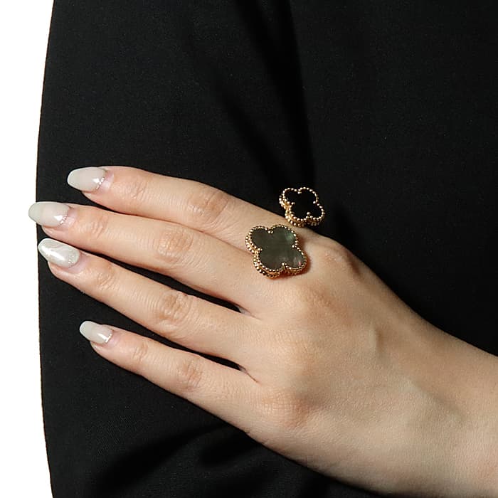 アントレレドアリングは、様々なモチーフがオープンリングに左右非対称にデザインされており、躍動感のあるモチーフが手元に目を惹きます。 このデザインが非常に可愛らしく、ヴァンクリーフ&アーペルらしいコレクションです。 ブランドの象徴とも言えるアルハンブラが使われ、シェルとオニキス、イエローゴールドと組み合わせが華やかな印象です。
