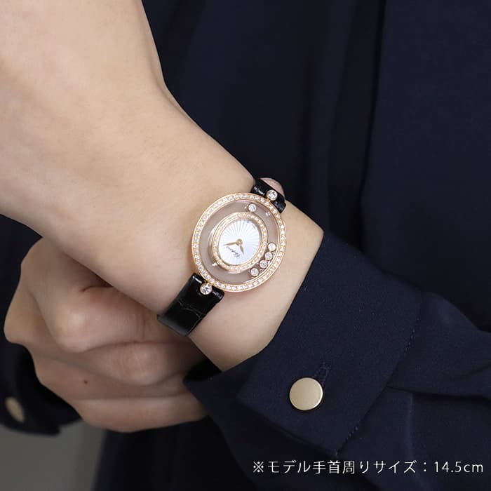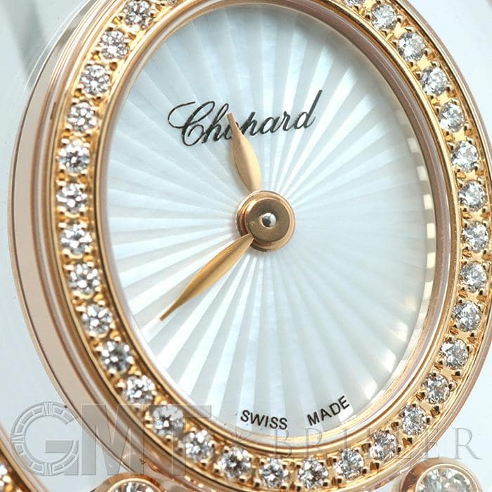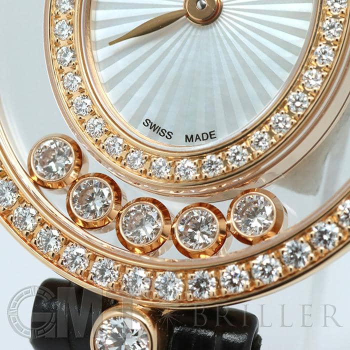腕時計の他に、ネックレスや指輪も展開されている「ハッピーダイヤモンド」は、ムービングダイヤモンドが2枚のサファイヤクリスタルの間をくるくると動き、生きる喜び(ジョワ・ド・ヴィーヴル)を表現した、美しく、可愛いコレクションです。オーバルなケースの形が珍しく、ローズゴールド素材、そこに贅沢にセッティングした合計0.91カラットものダイヤモンド、ギョーシェ装飾が施されたマザーオブパールの文字盤と相まってエレガントで気品が漂うジュエリーウォッチに仕上がっています。