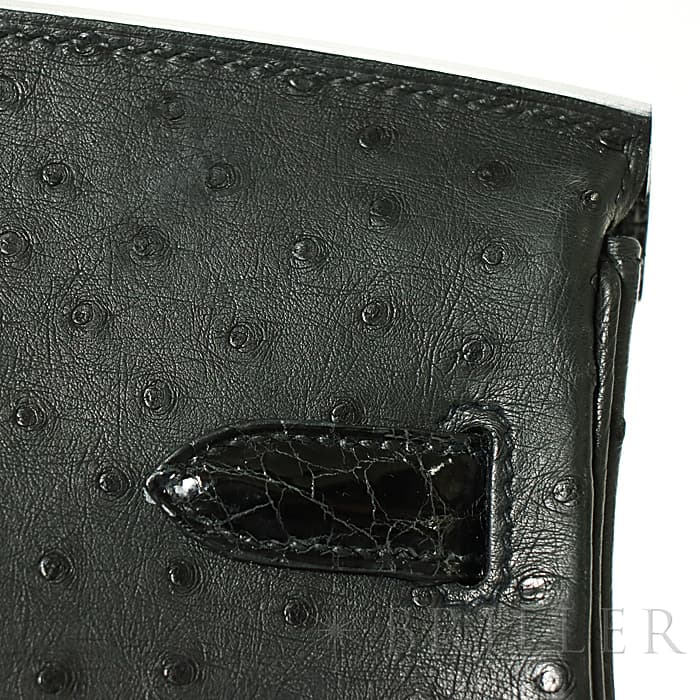 2つの素材を組み合わせた「バーキンタッチ」。ハンドル、フラップ、ベルトやクロシェットは光沢のある「アリゲーター」を使用し、水玉のような模様「クイルマーク」が特徴の「オーストリッチ」と合わせることでより高級感が溢れた雰囲気になっています。ブラックの色合いにゴールドの金具がエレガントのエッセンスを加えたラグジュアリーなバッグです。ブラックという何にでも相性の良いベーシックな色味なため、お手持ちのチャームやツイリーを巻くもよし、素材を引き立てるためにあえてチャームなども付けずにもっても華やかな主役として活躍してくれそうです。。こちらはZ刻印 (2021年)の大変オススメなお品物です。