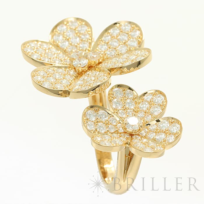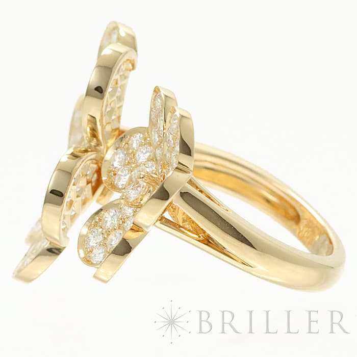 フランスに本店のあるハイジュエラー「ヴァンクリーフ&アーペル」。1906年に誕生し、数多くのセレブリティから愛されているブランドです。代表モデルの一つ「フリヴォル」コレクション。鏡面仕上げの18Kイエローゴールドの地金は立体的なハート形の花びらにデザインされ、ダイヤモンドがセッティングされています。デザインは女性らしい可憐なかわいらしさを持ち、ダイヤモンドが指本を華やかに輝かせてくれるリングです。