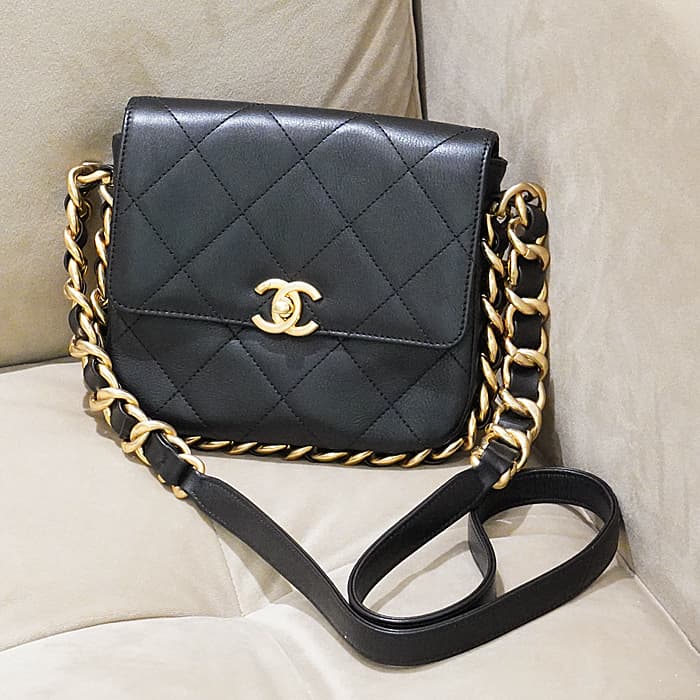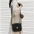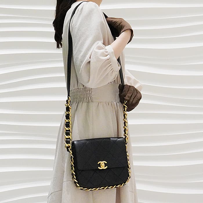 シャネルの中でも人気の高いブラックが入荷いたしました。クラシックさとアイコニックさを併せ持ったスモール フラップ バッグ です。シャネルのアイコンであるココマークと大ぶりなチェーンをバッグ側面にもあしらったモダンなデザインが、コーディネートのアクセントとして活躍してくれます。本体を半分程覆うフラップ、ターンロックとチェーンのみのシンプルなディティール、バッグ内側の赤の裏地など、80年代のセミヴィンテージを感じさせるデザインが特徴です。片方の肩にかけてもエレガントに使えるショルダーバッグです。