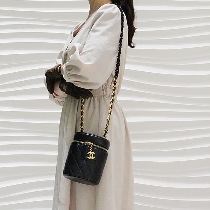 2022年の新作である スモール ヴァニティー ケース が入荷しました。シャネルらしいアイコニックなデザインと持ち運びやすいコンパクトなサイズ感が特徴です。ショルダーチェーンがゴールドとブラックで途中から切り替わっており、定番モデルには無いディティールをお楽しみいただけます。開閉のチャック部分にはシャネルのアイコンであるココマークがチャームとして使用されており、エレガントな雰囲気を演出してくれます。素材は滑らかなラムスキンが使われていて非常に合わせやすく、クラシック、フェミニン、カジュアルと様々なスタイリングにマッチするショルダーバッグです。