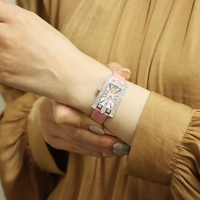 「キング・オブ・ダイヤモンド」ハリー・ウィンストンを代表するタイムピース「アヴェニュー」。ハリーウィンストンが本店を構える、ニューヨークの雰囲気を表現した人気コレクションです。ピンクのシェル文字盤には、19個のラウンドブリアントカットのダイヤモンドで彩られたスモールセコンドがレイアウトされています。ホワイトゴールドのケースには、さらに合計約3.76カラットのダイヤモンドがセッティングされ、ひときわラグジュアリーな輝きで手元を彩るジュエリーウォッチです。