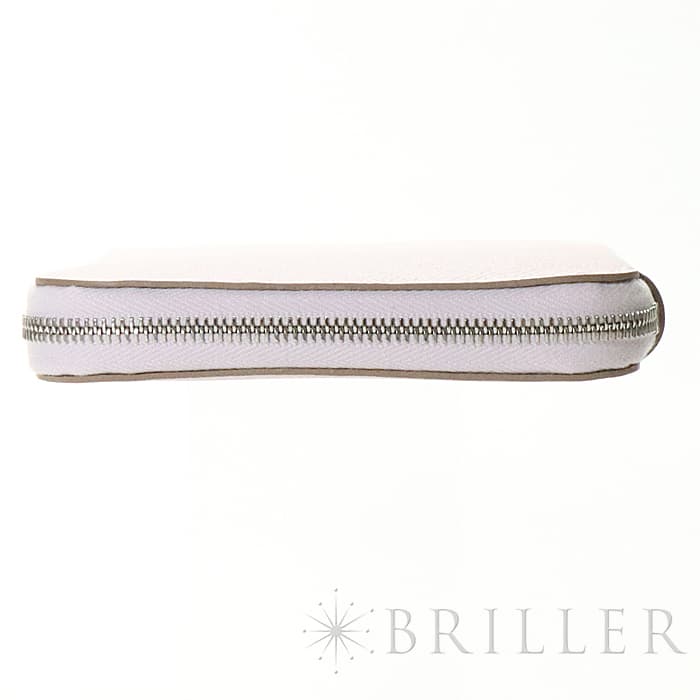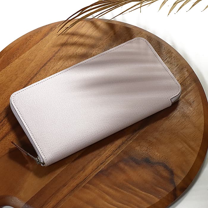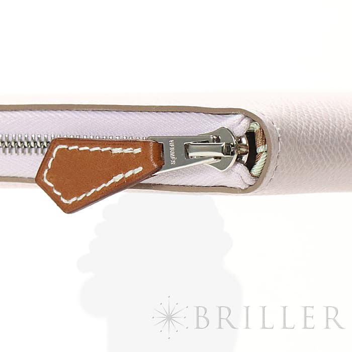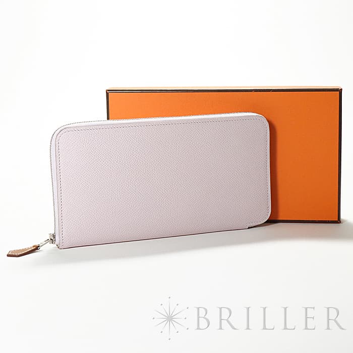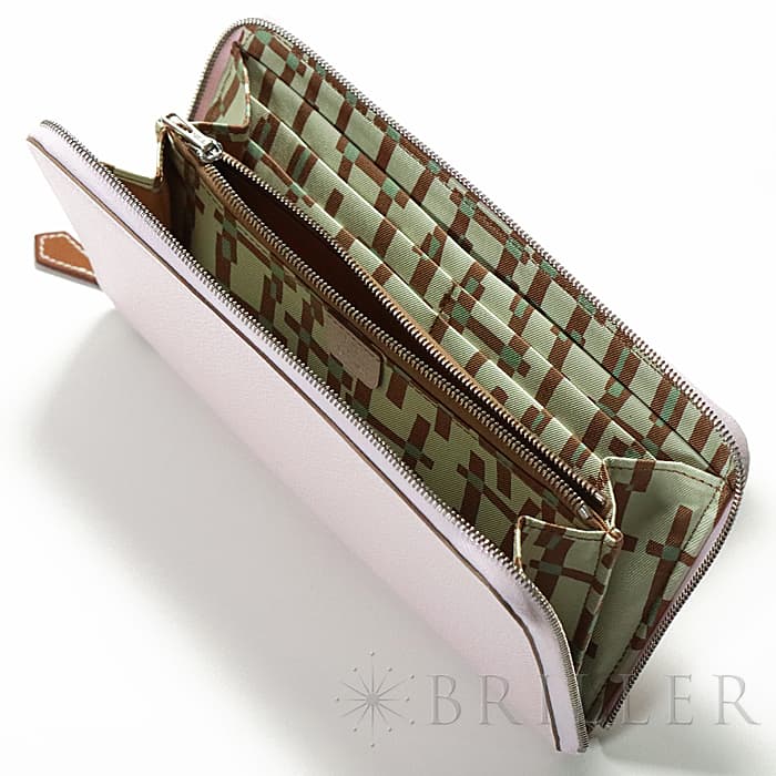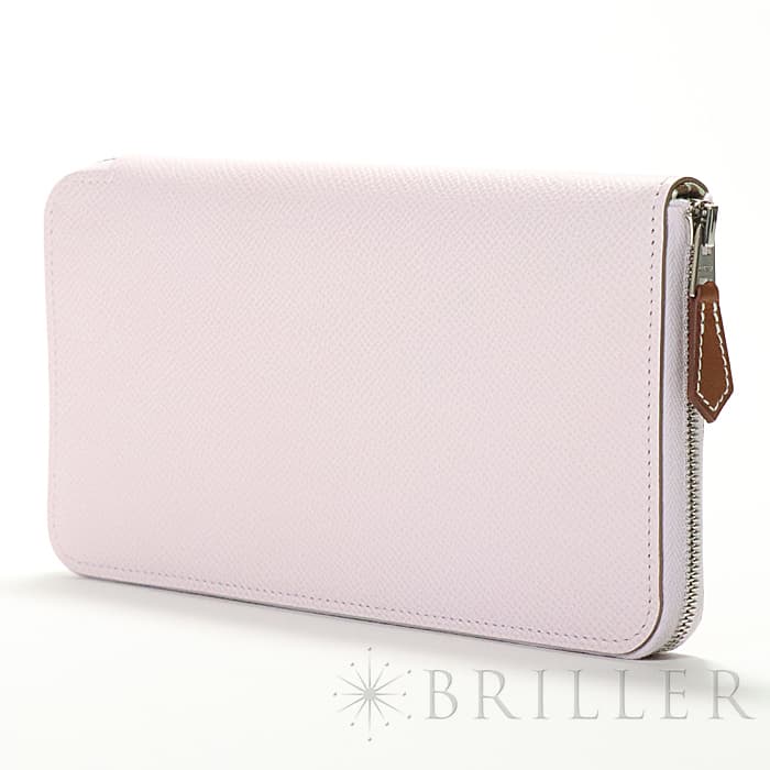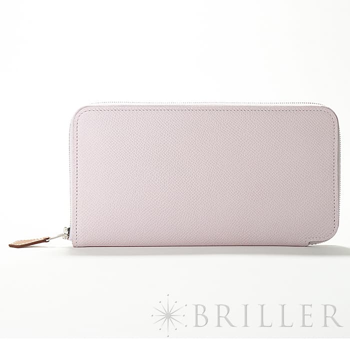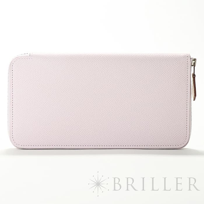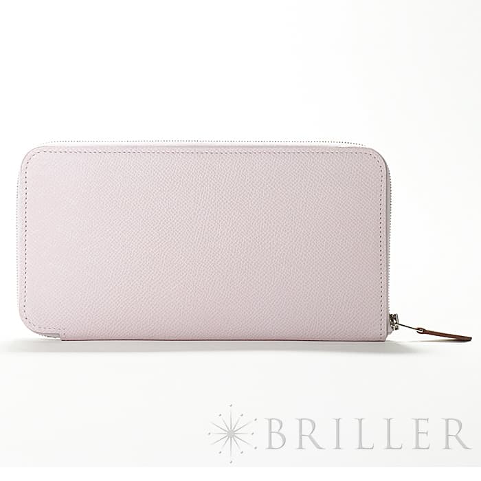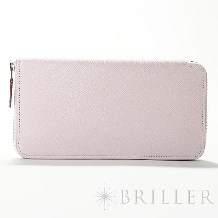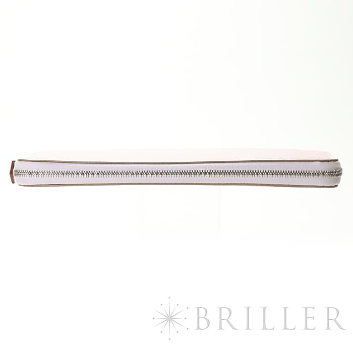 角が丸みを帯びたシンプルな長方形のデザインに、ラウンドファスナーが組み合わさった「アザップ」。エルメスのお財布の中でも、すっきりとして上品なフォルムが人気のコレクションで、「シルクイン」は内側にカレと同じシルク生地があしらわれた美しいアイテムです。内側にはカードポケットが合計12、中央に小銭入れが付いています。約1.5cmの厚さは女性の手でも持ちやすく、バッグの中でもかさばりにくいサイズ感です。淡いピンクカラーが特徴の「モーヴシルベストル」に内側にはライムカラーを使用し可愛らしさと爽やかさを兼ね備えたモデルです。U刻印(2022年)の新品です。