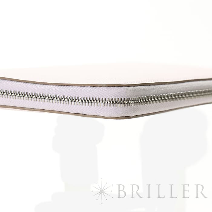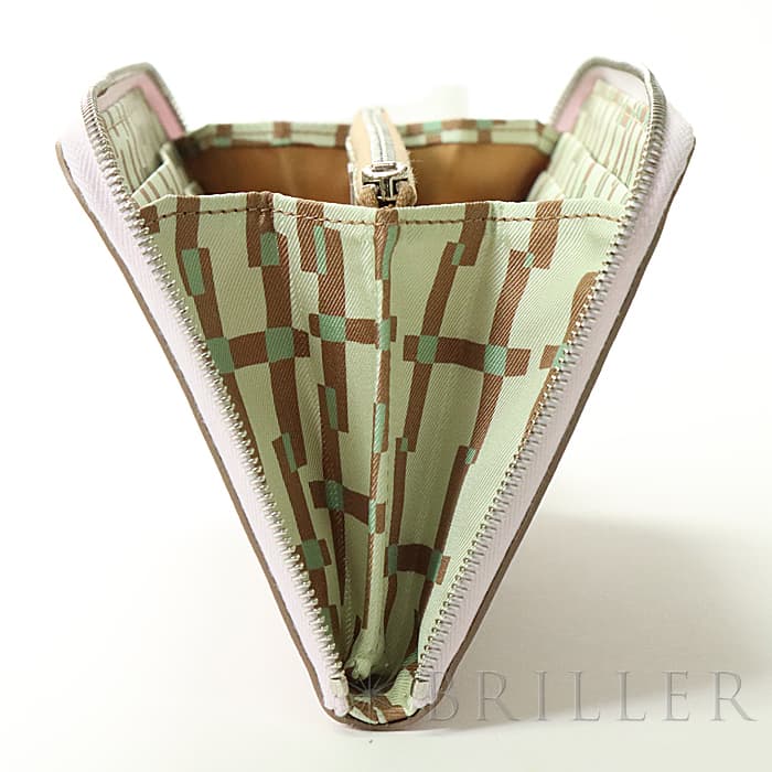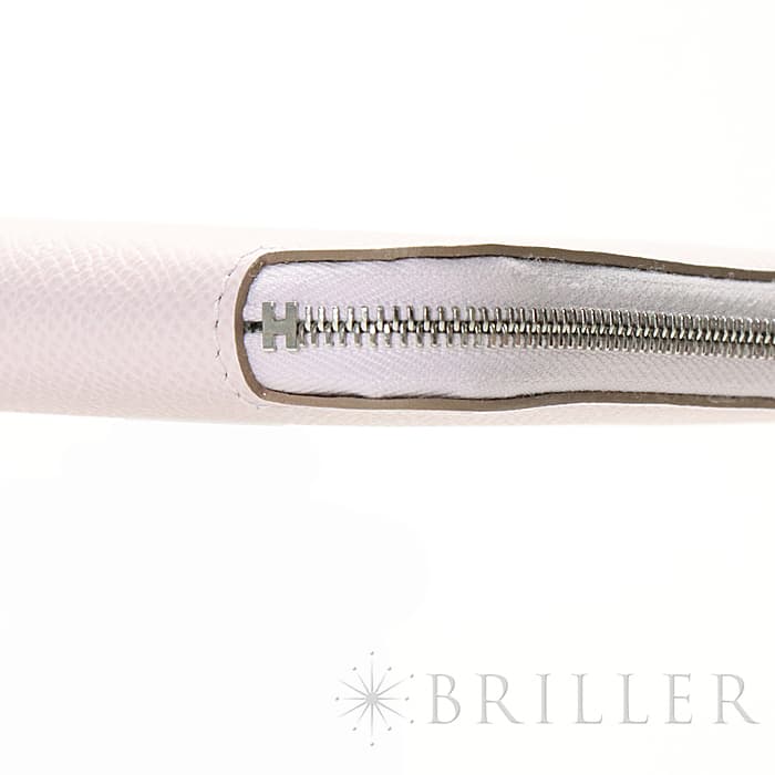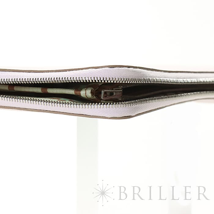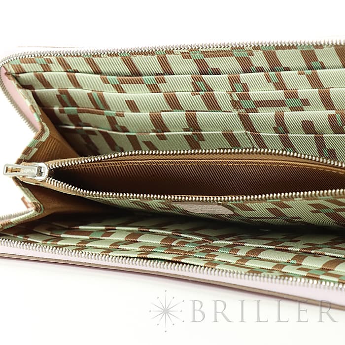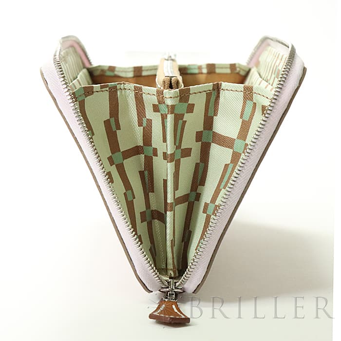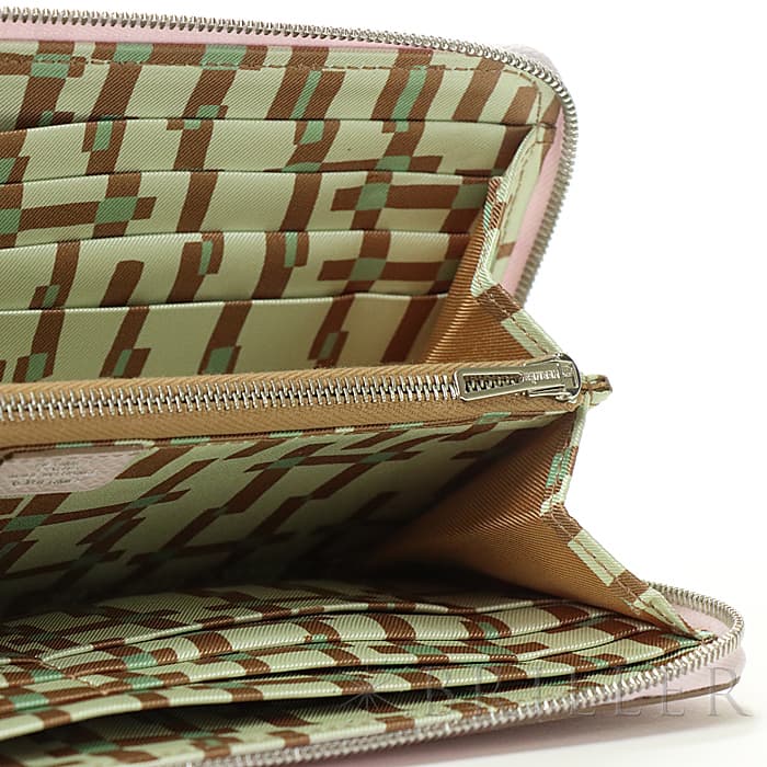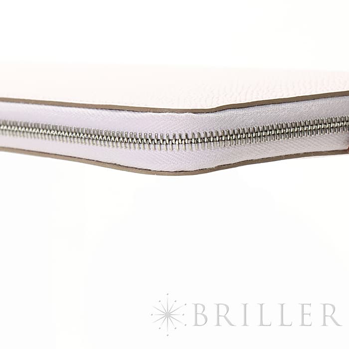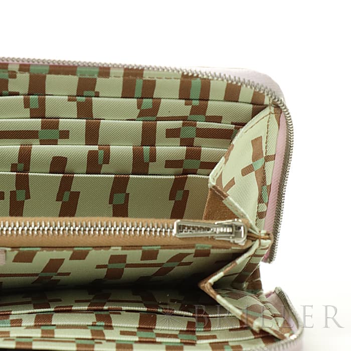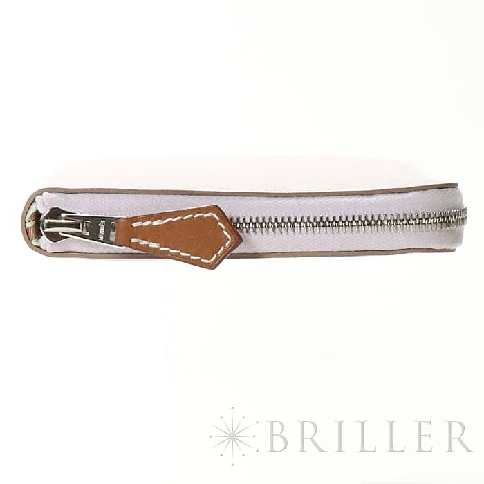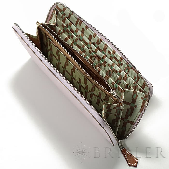 角が丸みを帯びたシンプルな長方形のデザインに、ラウンドファスナーが組み合わさった「アザップ」。エルメスのお財布の中でも、すっきりとして上品なフォルムが人気のコレクションで、「シルクイン」は内側にカレと同じシルク生地があしらわれた美しいアイテムです。内側にはカードポケットが合計12、中央に小銭入れが付いています。約1.5cmの厚さは女性の手でも持ちやすく、バッグの中でもかさばりにくいサイズ感です。淡いピンクカラーが特徴の「モーヴシルベストル」に内側にはライムカラーを使用し可愛らしさと爽やかさを兼ね備えたモデルです。U刻印(2022年)の新品です。