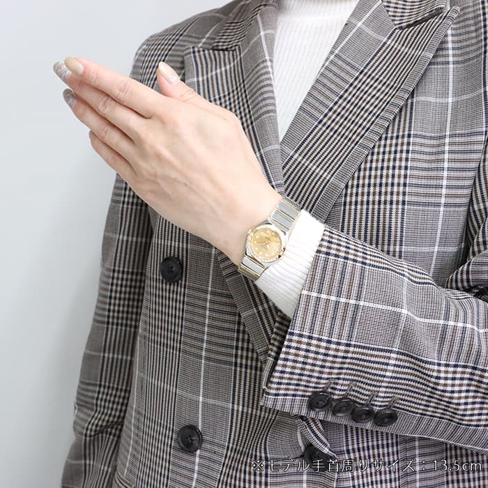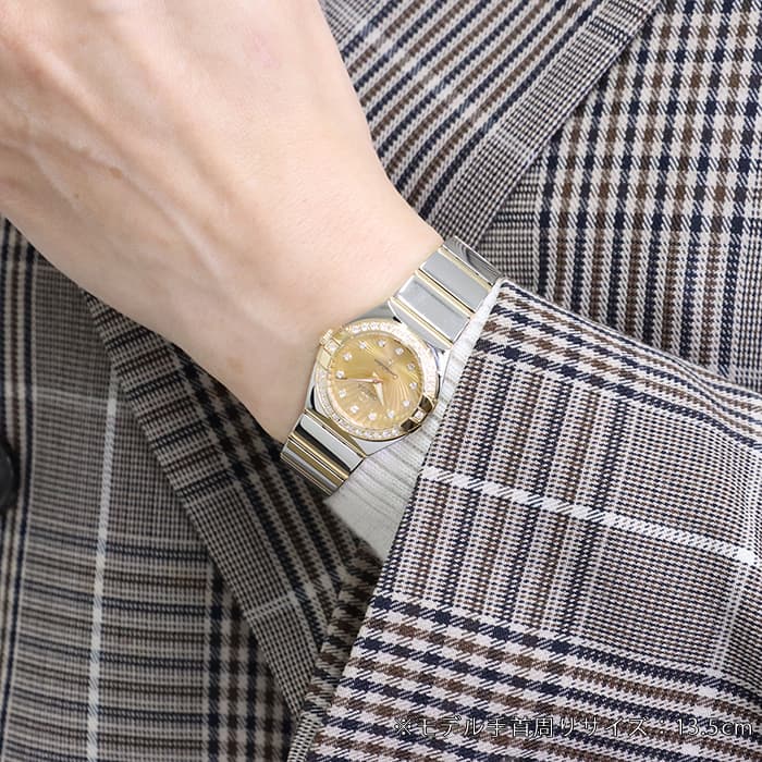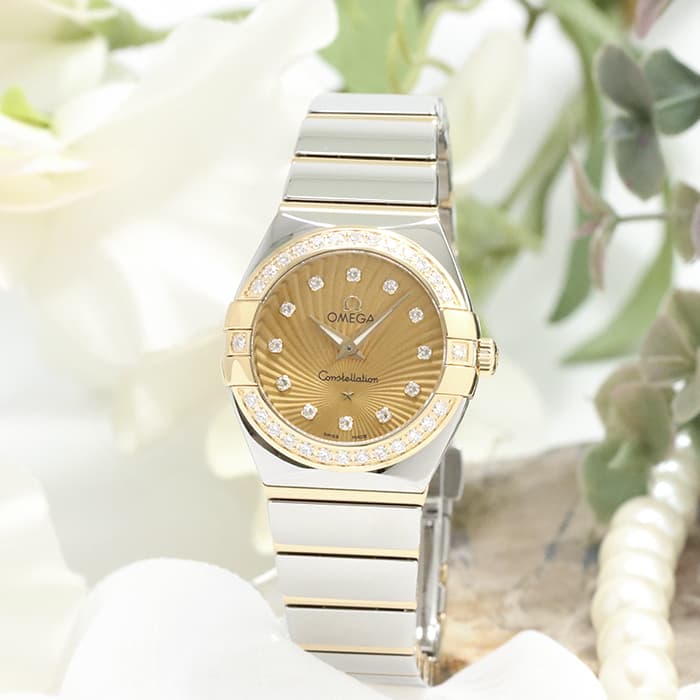 1982年からオメガのプレステージモデルとして厚い支持を得ている「コンステレーション」。スーパーノヴァ模様が装飾されたシャンパン色のダイアルには、輝く12個のダイヤモンドをインデックスにセッティング。コンステレーションを象徴する「爪」を伝承するダイヤベゼルとの組み合わせがワンランク上のラグジュアリーさを演出しています。また、24mm径とコンパクトなケースとブレスはステンレスとイエローゴールドのコンビ仕様になっており、手首を華やかに飾る時計でございます。ムーブメントにはクォーツキャリバー「1376」を搭載。巻き上げの手間がなく、気軽に時計をお使いになられたい方に大変お勧めです。