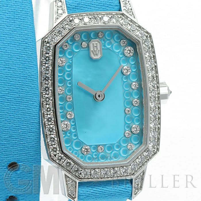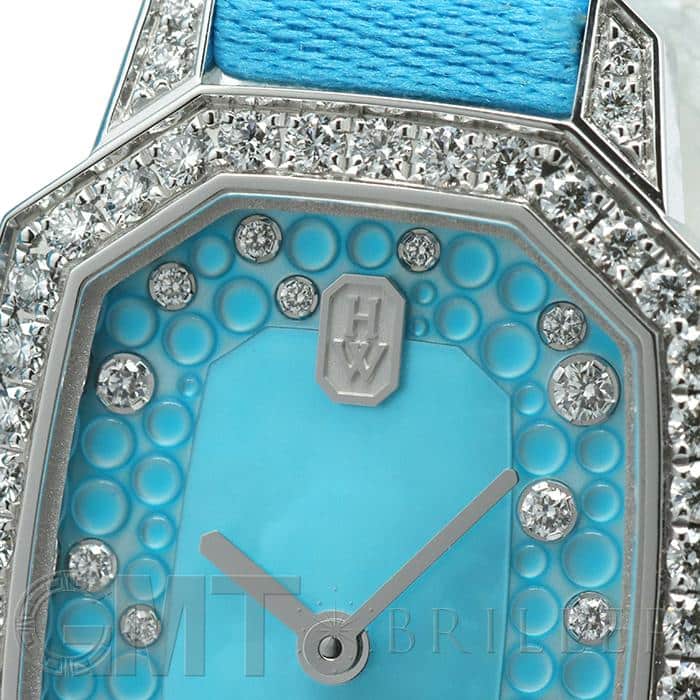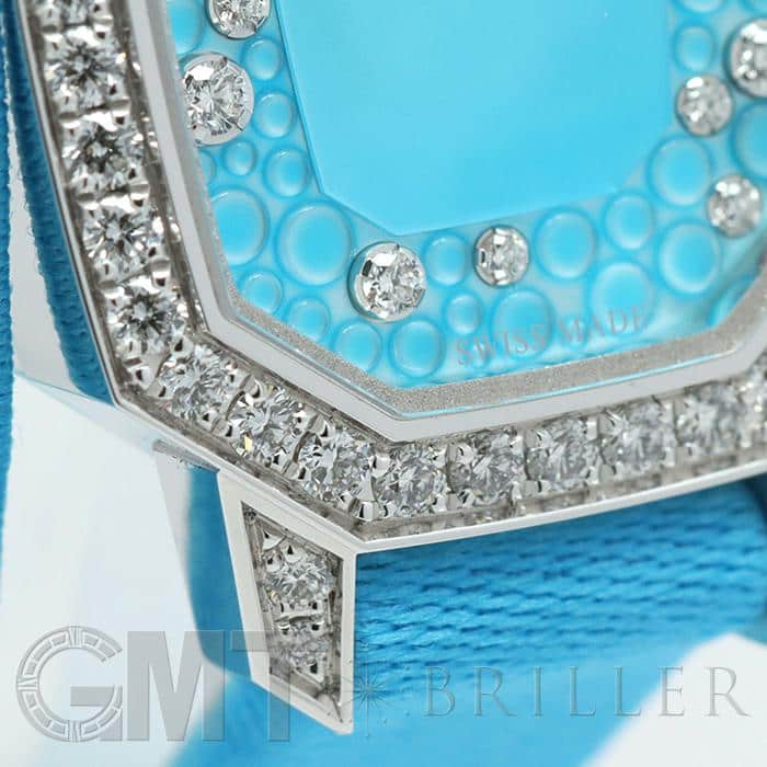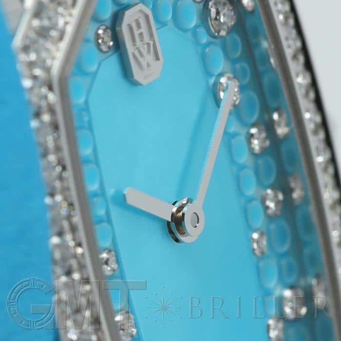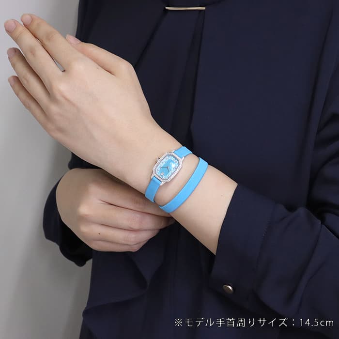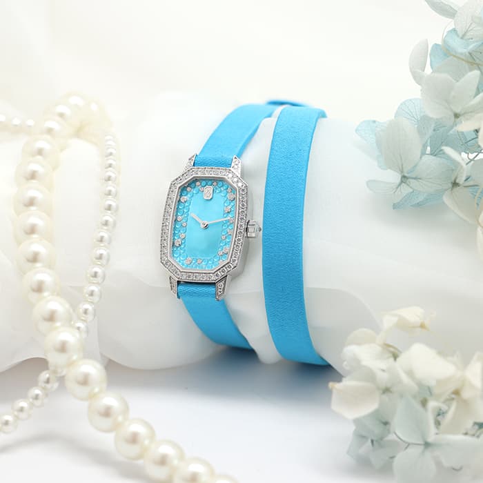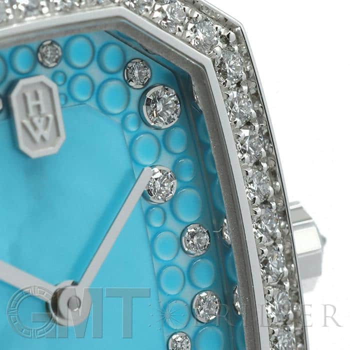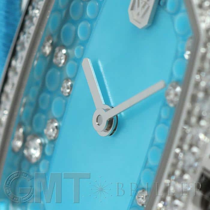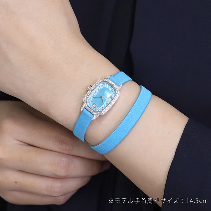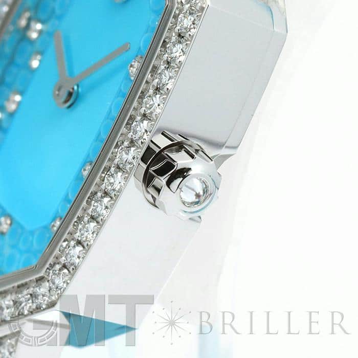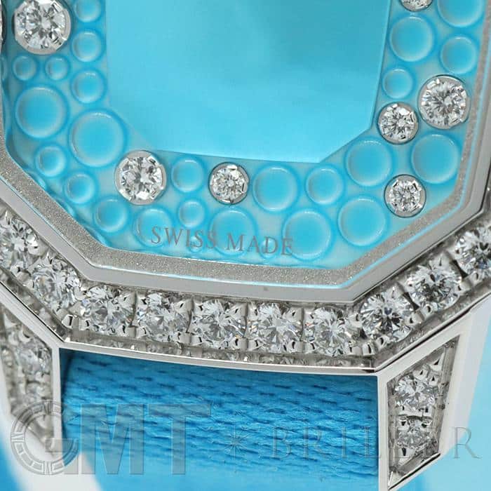 ダイヤルには鮮やかなターコイズカラーのシェルを使用しこちらにもダイヤモンドを20個セッティングしております。
