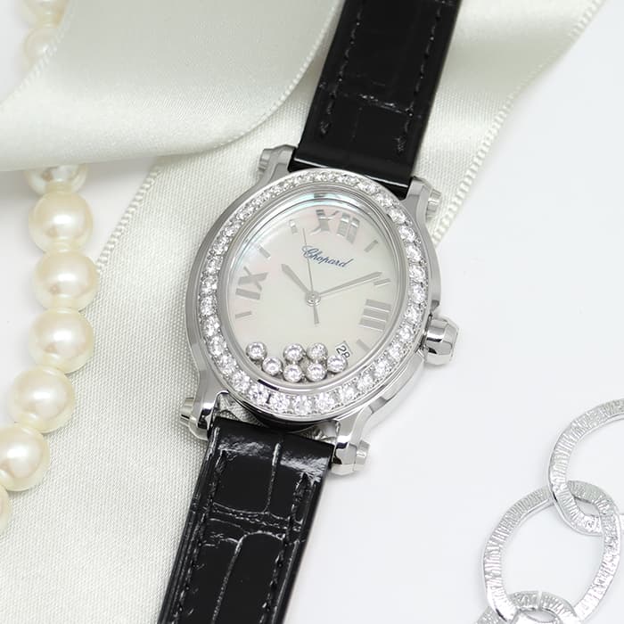 ショパールをのアイコンウォッチの一つ、「ハッピーダイヤモンド」のヒットを受け、1993年に発表された「ハッピースポーツ」は、文字盤上を動くムービングダイヤが特徴の腕時計です。可愛らしいオーバル型ケースが腕元にスッキリ収まり、ベゼルに贅沢にセッティングされたダイヤモンドがショパールらしい高級感を演出します。ムーブメントにはクォーツ(電池式)を搭載しており気軽にご使用いただけます。華やかかつ実用的なお勧めの一本です。
