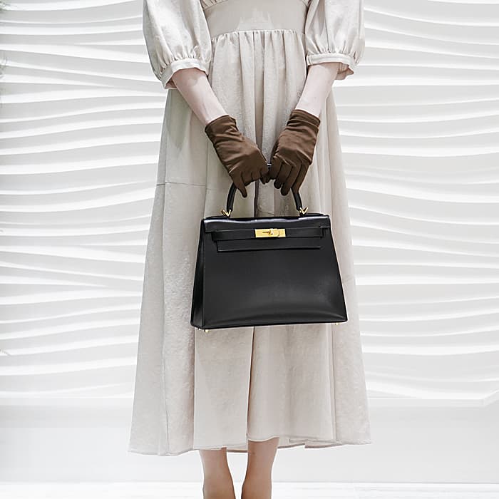 「ケリー」は元々「サック・ア・クロア」という名前で1935年に誕生。女優であったグレース・ケリーがモナコ王妃となり、妊娠した様子を鞄でとっさに隠した写真が話題に。後に「ケリーバッグ」と称されました。こちらは素材に優美な光沢感があるフォーマル素材「ボックスカーフ」を使用しており、ファーストエルメスとして絶大な人気を誇るブラックとゴールド金具の組み合わせがリッチでエレガントな雰囲気を演出します。28サイズはハンドバッグとして軽やかに持ち運ぶことができつつ、ハンドルに腕を通して持つこともできる絶妙なサイズ感。ストラップを付けると肩から掛けることもできるので、装いやシーンに合わせて様々なスタイルでお楽しみいただけます。U刻印(2022年)の新品のお品物です。