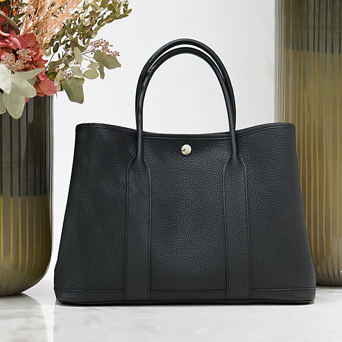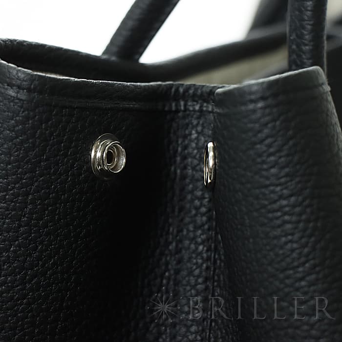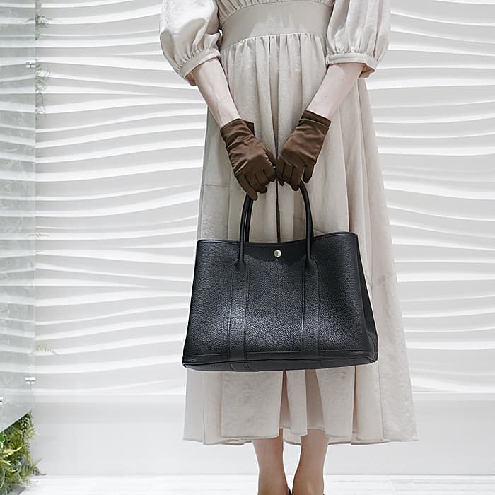 元々はガーデニング用品を入れるバッグとして作られ、エルメスを代表するカジュアルラインのトートバッグ「ガーデンパーティー」。カシメ金具が左右と中央の3か所に付いているので、開け閉めや荷物の取り出しもスムーズに行えます。PMサイズはA4や500mlのペットボトルがすっぽり収まり、小旅行程度の荷物も収納いただけるサイズ感です。しっかりしたマチで型崩れしにくく、荷物が多い方に安心の万能バッグです。