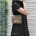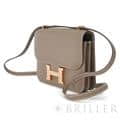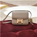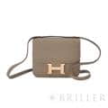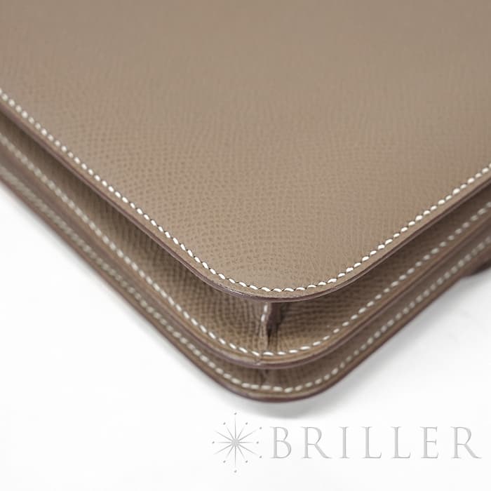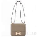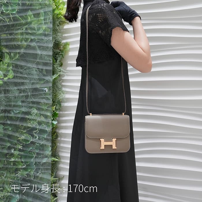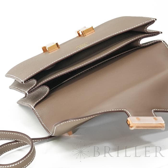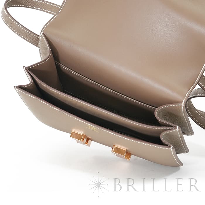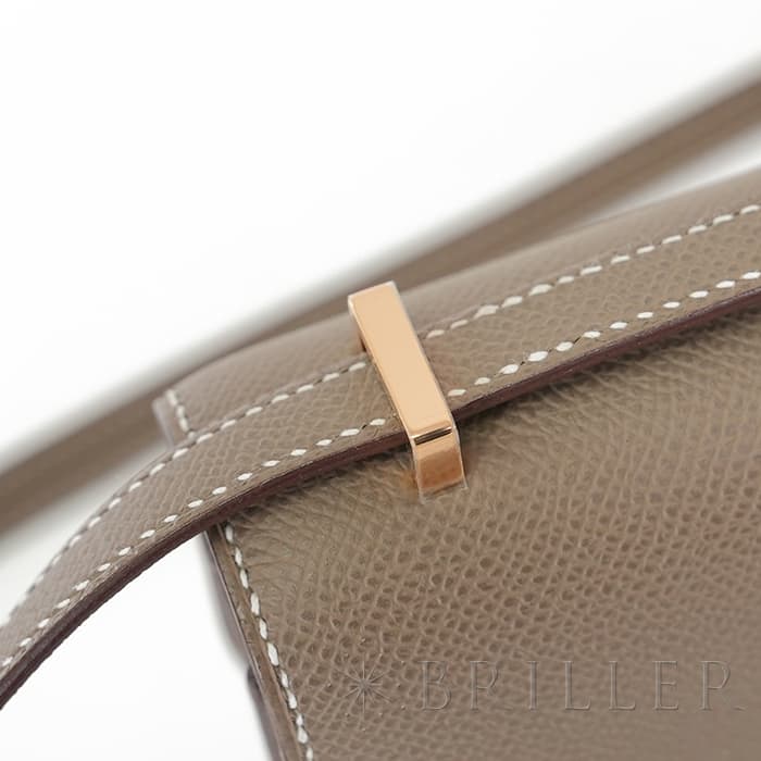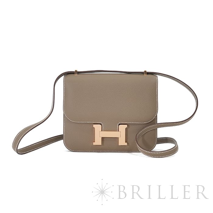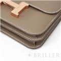 エルメス コンスタンス3 ミニ ミロワール エプソン エトゥープ ピンクゴールド金具 HERMES 小ぶりのコロンとしたフォルムが可愛らしいコンスタンス3 ミニ。こちらのお品物は2023年に登場した新型となっており、オープンポケットが2つから3つへ増加しているほか、付属品にミラーが付いています。お色味はエルメスの定番グレージュ「エトゥープ」となっており、ピンクゴールド金具との組み合わせが上品なアイテムです。ショルダーを1連にして斜め掛けにもできるサイズ感で、エレガントに使いたい時は2連にして小脇に抱えればドレスアップしたスタイルにもマッチします。 W刻印(2024年)