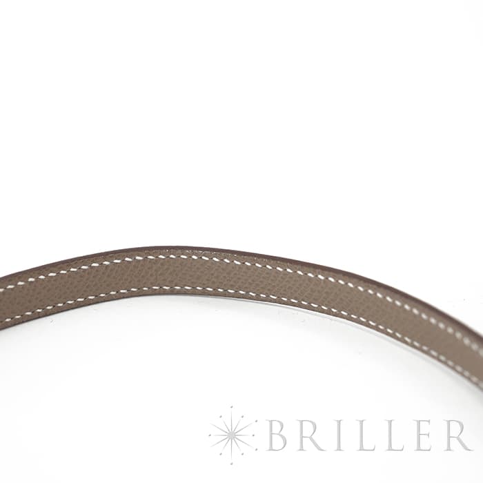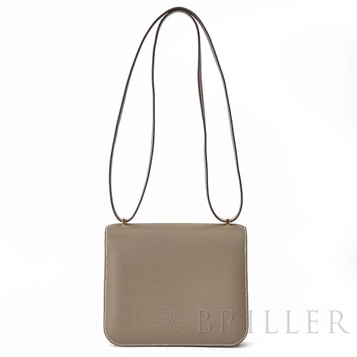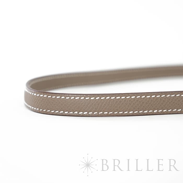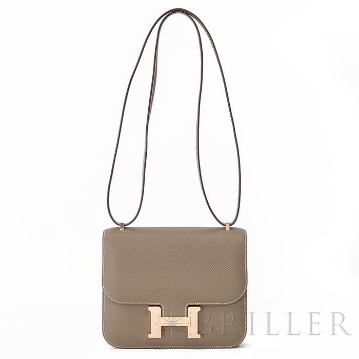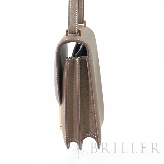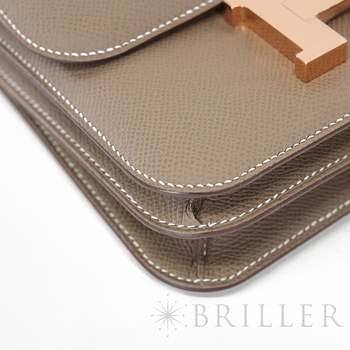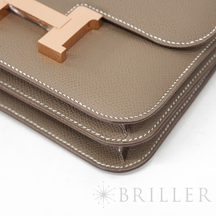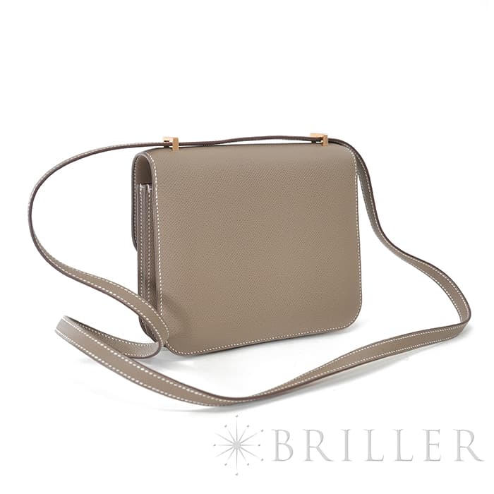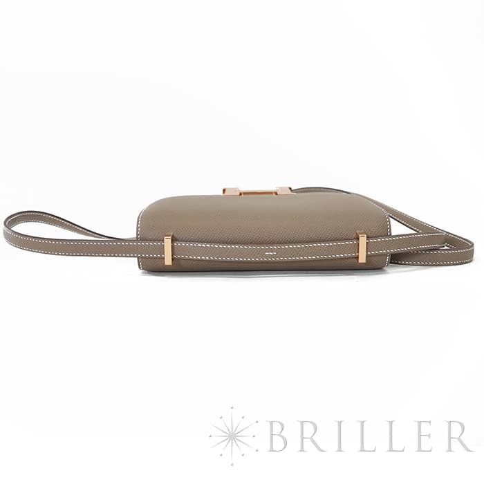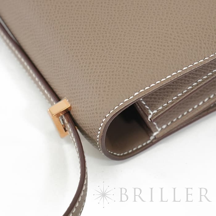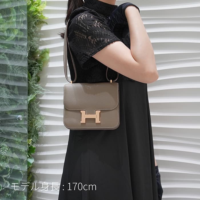小ぶりのコロンとしたフォルムが可愛らしいコンスタンス3 ミニ。こちらのお品物は2023年に登場した新型となっており、オープンポケットが2つから3つへ増加しているほか、付属品にミラーが付いています。お色味はエルメスの定番グレージュ「エトゥープ」となっており、ピンクゴールド金具との組み合わせが上品なアイテムです。ショルダーを1連にして斜め掛けにもできるサイズ感で、エレガントに使いたい時は2連にして小脇に抱えればドレスアップしたスタイルにもマッチします。