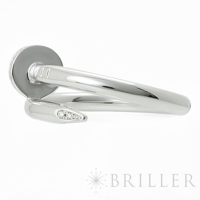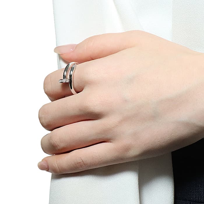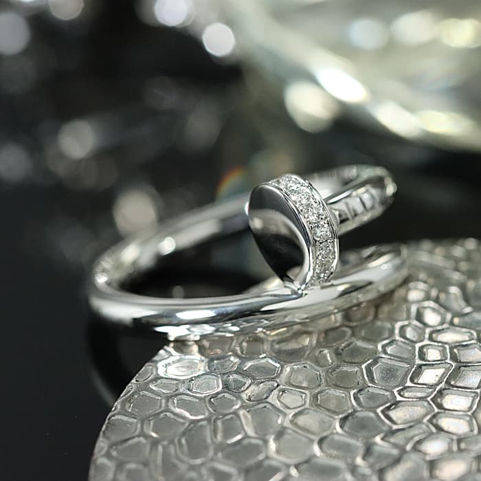 フランスで誕生し、独創的なデザインや技術力の高さから圧倒的な支持を受けるブランド「カルティエ」。1本の釘から誕生したジュエリー「ジュスト アンクル」は刺激的かつ力強さのあるコレクションです。ダイヤモンドがセッティングされたこちらのリングは素材にホワイトゴールドを使用しており、甘すぎない大人のジュエリーとしておすすめです。