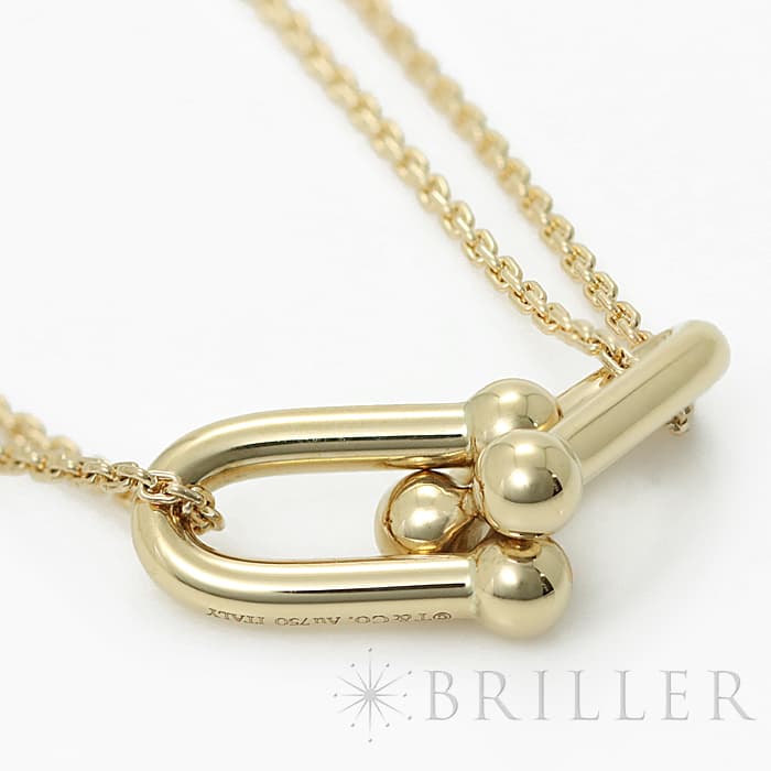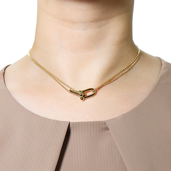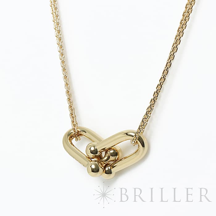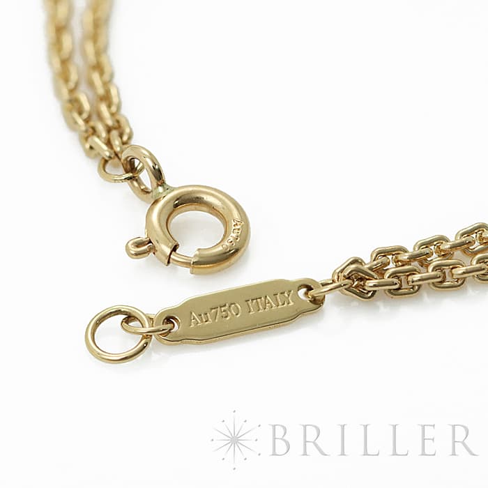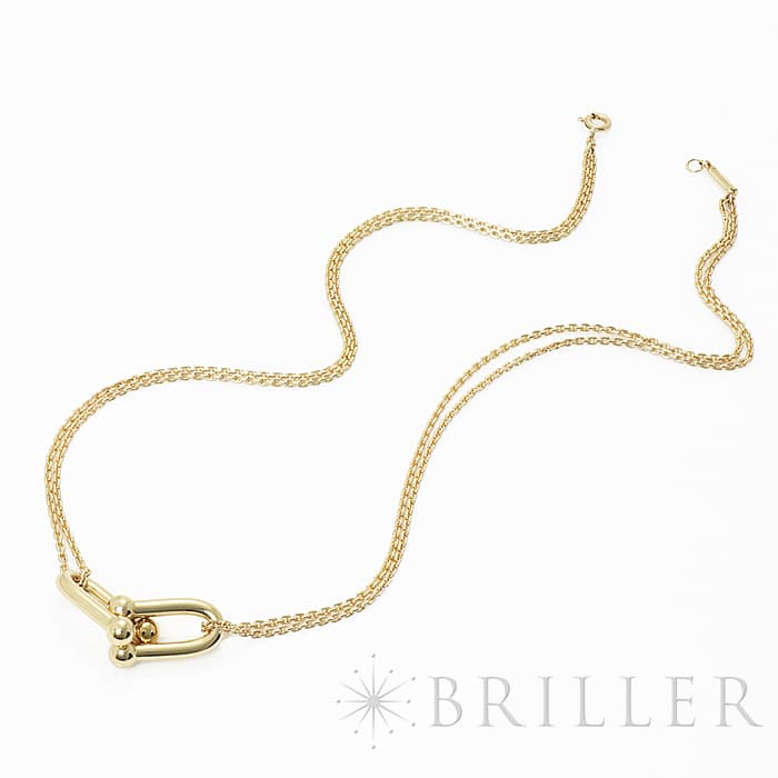 アメリカ・ニューヨークの街並みや行きかう人々のスピリットに着想を得たティファニー ハードウェアは、エッジの効いたモダンなデザインが特徴です。こちらはイエローゴールドを使用しており、ゲージリンクと華奢なチェーンの組み合わせが女性らしさを演出します。