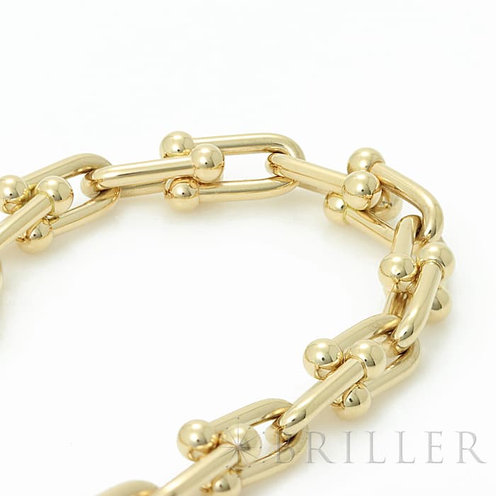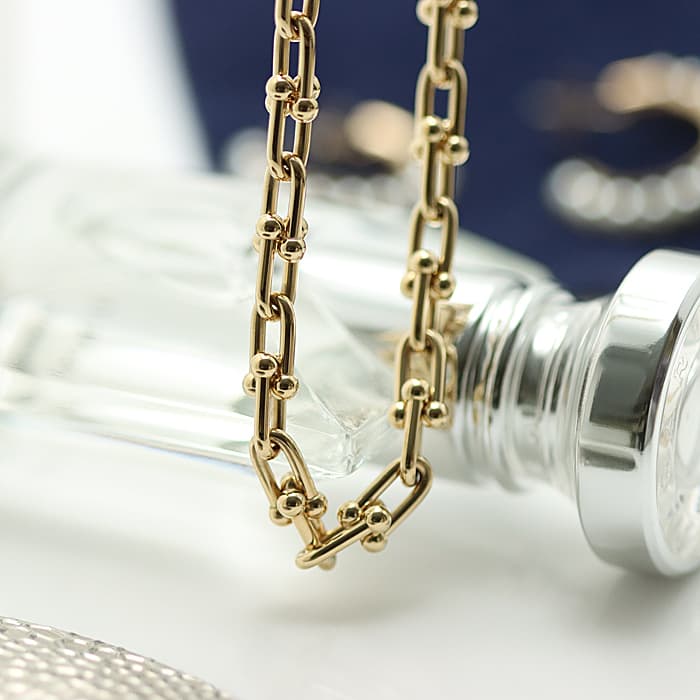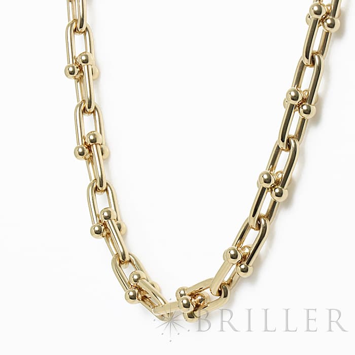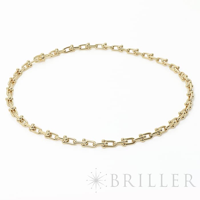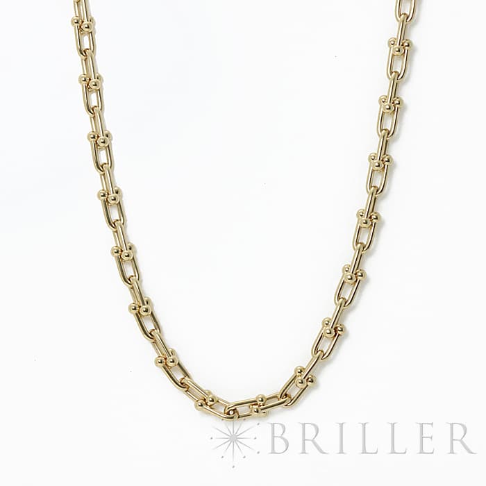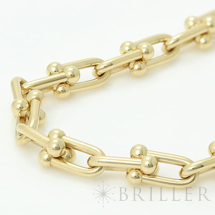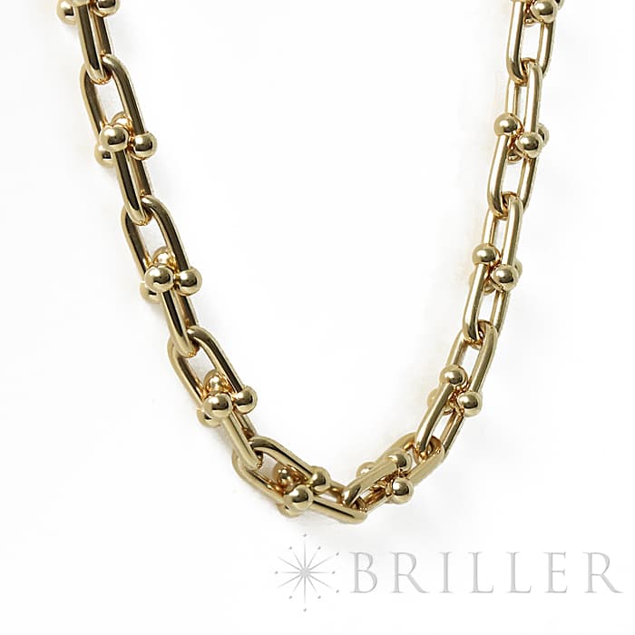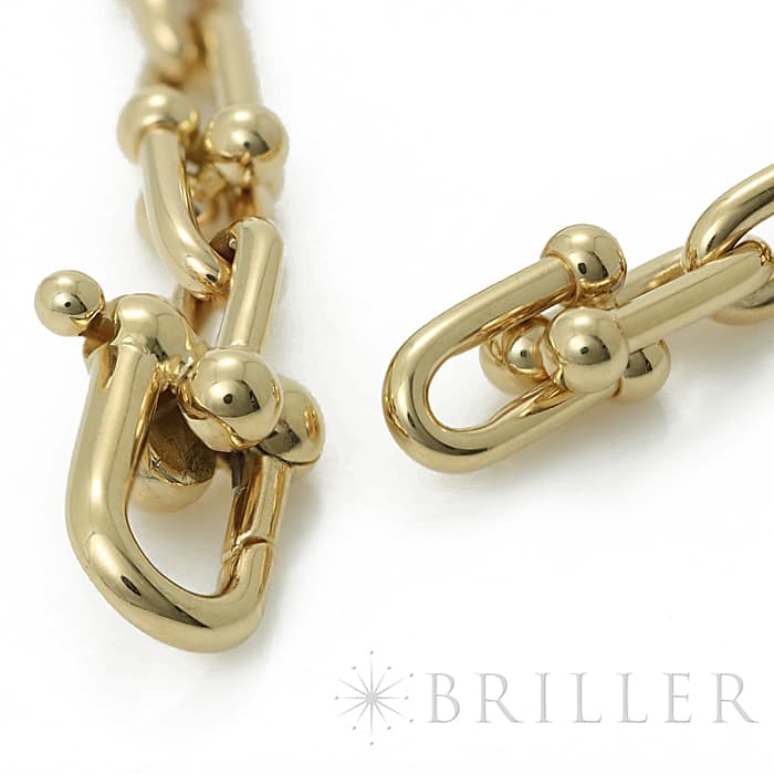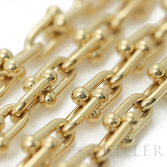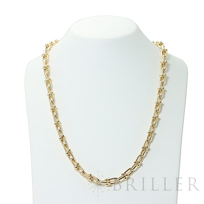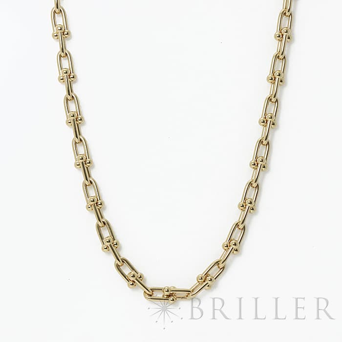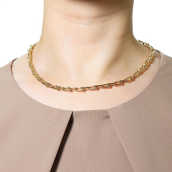 アメリカ・ニューヨークの街並みや行きかう人々のスピリットに着想を得たティファニー ハードウェアは、エッジの効いたモダンなデザインが特徴です。イエローゴールドのゲージリンクが連なった大胆なネックレスはファッションにアクセントをプラスしてくれます。