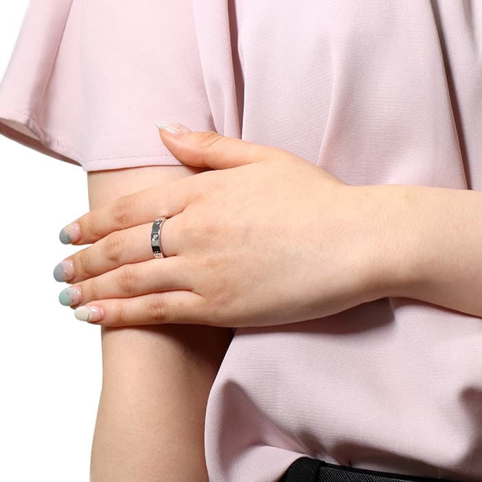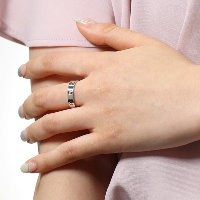 フランスで誕生し世界五大ジュエラーの一角である「カルティエ」。カルティエが手掛ける「束縛」や「愛の絆」をテーマにして作られた「ラブコレクション」は、老若男女問わず不動の人気を博しています。その中でも、「愛を閉じ込める」という意味のビスマークが刻印された「ラグリング」は、ペアリングとして購入される方も非常に多い人気ラインです。こちらのモデルはホワイトゴールド素材。ビス部分には1Pダイヤモンドをあしらった、シンプルながらもしっかりと存在感のある大変オススメの指輪です。